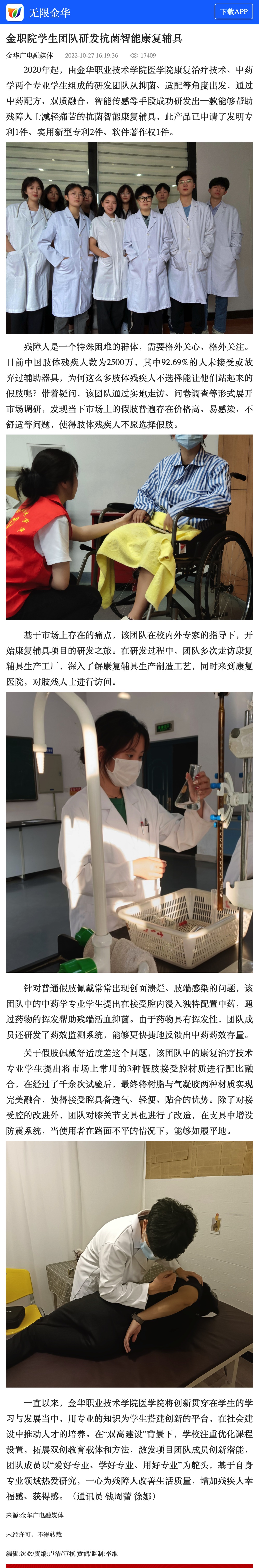 无限金华:金职院学生团队研发抗菌智能康复辅具