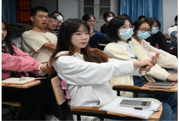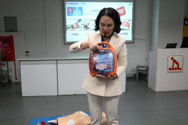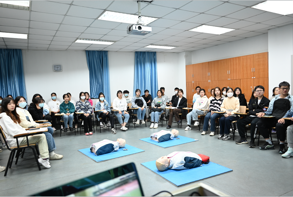 培训中,潘超君以韩国首尔龙山区梨泰院的踩踏事件作为切入点,详细讲解了发生紧急情况心肺复苏的步骤及关键要领、气道异物梗阻的急救处理、自动体外除颤器(AED)的使用、创伤救护(止血、包扎、固定及转运)等急救知识,向现场同学普及应急救护知识,提升大家在危急时刻的救护能力。