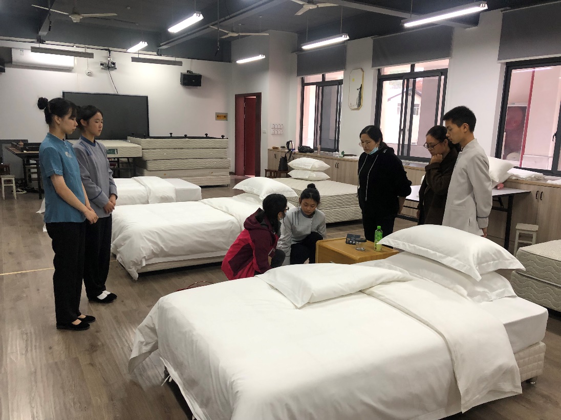 走访中,金职院旅游学院酒店管理与数字化专业相关负责人与龙泉市中等职业学校旅游服务与管理专业教师互动交流,重点了解该校技能教学的安排、学生技能竞赛的历年成绩等基本情况,并分享了金职院旅游学院在专业实践教学的安排和技能竞赛方面等诸多经验。同时,对正在备赛丽水市中职学校学生技能竞赛的4名参赛选手和指导教师,进行了一对一、手把手的教学指导,从前厅、餐饮、客房等赛项的训练方案、职业礼仪、技术技能和竞赛服装等方面提出了意见和建议。