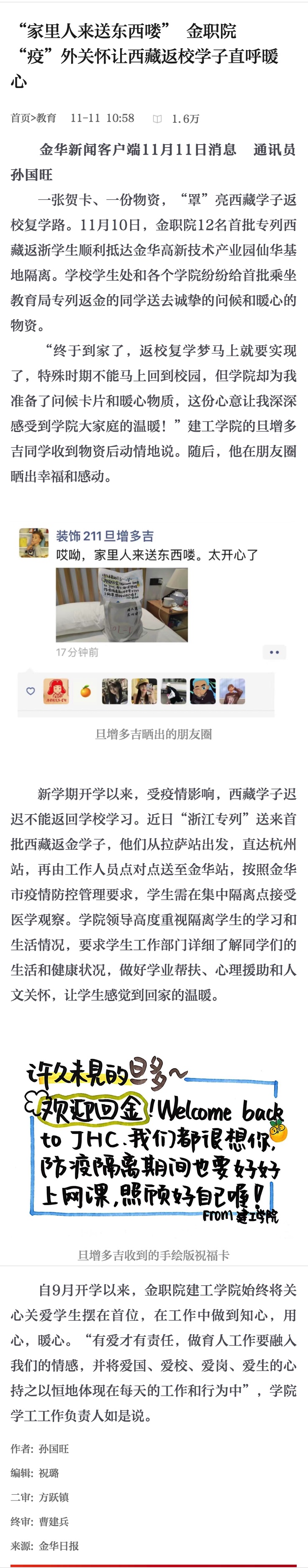 金华新闻客户端:“家里人来送东西喽” 金职院“疫”外关怀让西藏返校学子直呼暖心