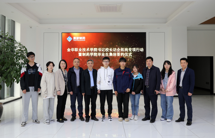 为贯彻落实教育部办公厅关于开展2023届高校毕业生春季促就业攻坚行动的决策部署,抢抓春季促就业工作关键期,加快推动就业工作进展,4月13日,校长梁克东、副校长陈海荣、制药学院负责人及相关师生代表赴金华健康生物医药产业园开展书记校长“访企拓岗促就业”专项行动暨制药学院2023届毕业生集体签约仪式。