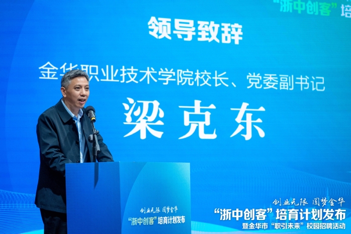 梁克东代表学校向来参加此次活动的领导、嘉宾表示欢迎,并向大家简要介绍了学校就业创业工作。他指出,就业是民生之本,是最大的民生工程、民心工程、根基工程。此次“浙中创客”培育计划发布暨金华市“职引未来”校园招聘活动在学校启动,这是我市深入实施就业优先战略、积极响应稳就业政策的重要举措,更是学校营造浓厚双创氛围、促进充分就业的重要方式。接下来,学校将一如既往全面落实党中央、国务院“稳就业”“保就业”决策部署,充分联动政校行企、汇聚各方资源、发挥桥梁纽带作用,提升学生就业能力、激发学生创造活力,为学生高质量充分就业提供坚强的支持。