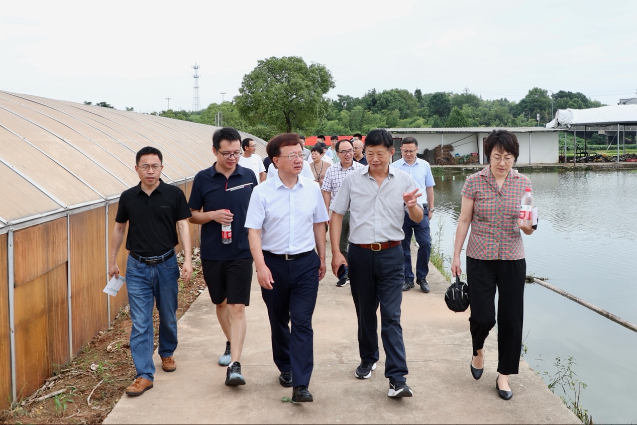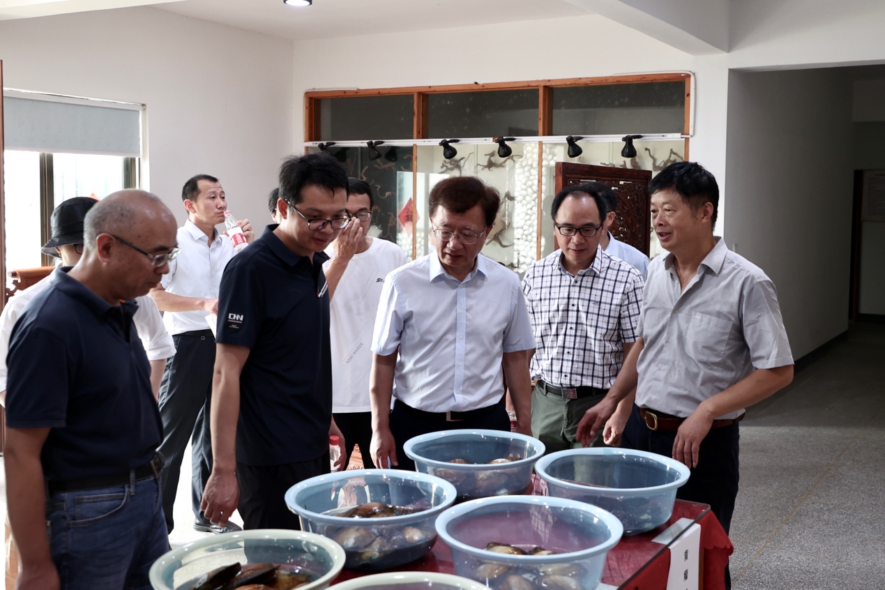 调研组一行首先来到国家贝类产业技术体系金华综合试验站核心示范区(国家级三角帆蚌良种场),实地走访了金华试验站核心示范区育苗室、小蚌培育池、良种亲蚌培育池、配种池、综合实验楼贝类标本室,现场查看了试验站保种和选育的背瘤丽蚌、褶纹冠蚌、鹰蚌和不同三角帆蚌新品系,听取了金华试验站新任站长、金职院农学院教授罗雨关于“淡水珍珠产业现状及存在问题”的汇报。李清和宋林生对金华站的工作给予了肯定,并对金华站未来工作提出了更高的要求。