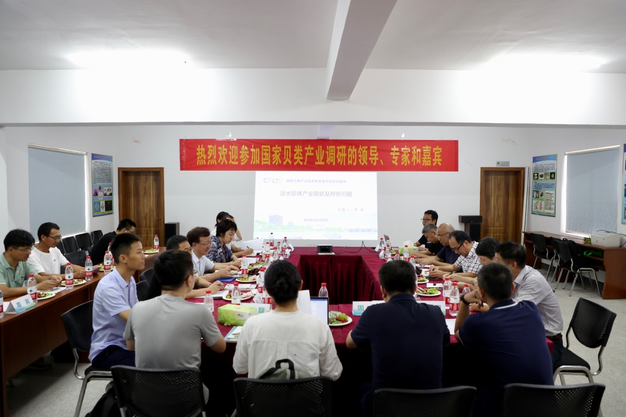 7月30日上午,全国水产技术推广总站总工程师李清、全国水产技术推广总站疫病防控处处长冯东岳、国家贝类产业技术体系首席科学家宋林生、副首席科学家蒋增杰和淡水珍珠育种岗、养殖岗等体系专家一行12人来到金职院金华综合试验站,开展淡水珍珠产业调研。浙江省水产技术推广总站副站长周凡,金华市水产技术推广站站长李明,金职院纪委书记徐领、科技处和农学院相关负责人,淡水珍珠蚌苗繁育和深加工企业代表共30余人参加座谈。