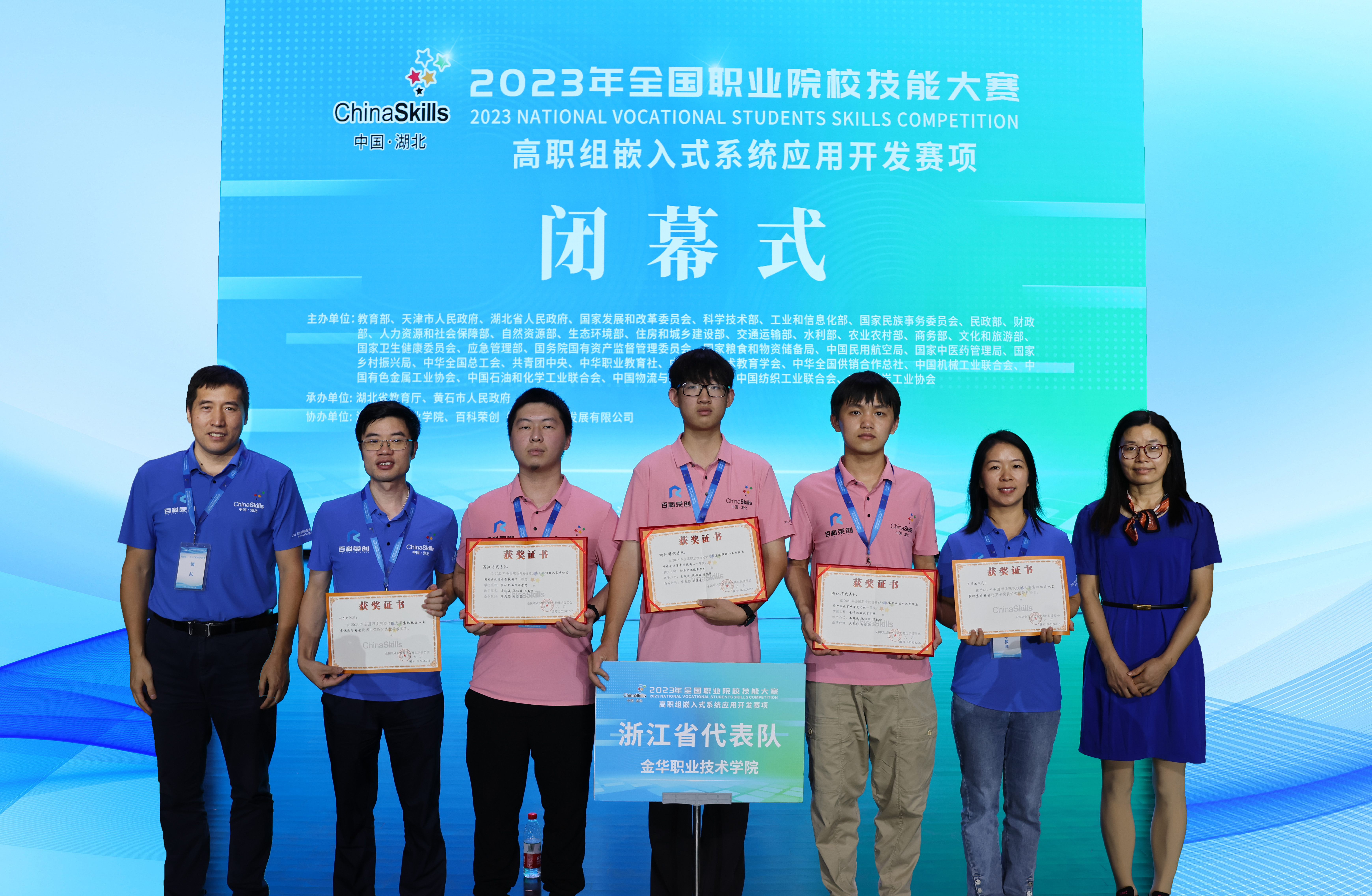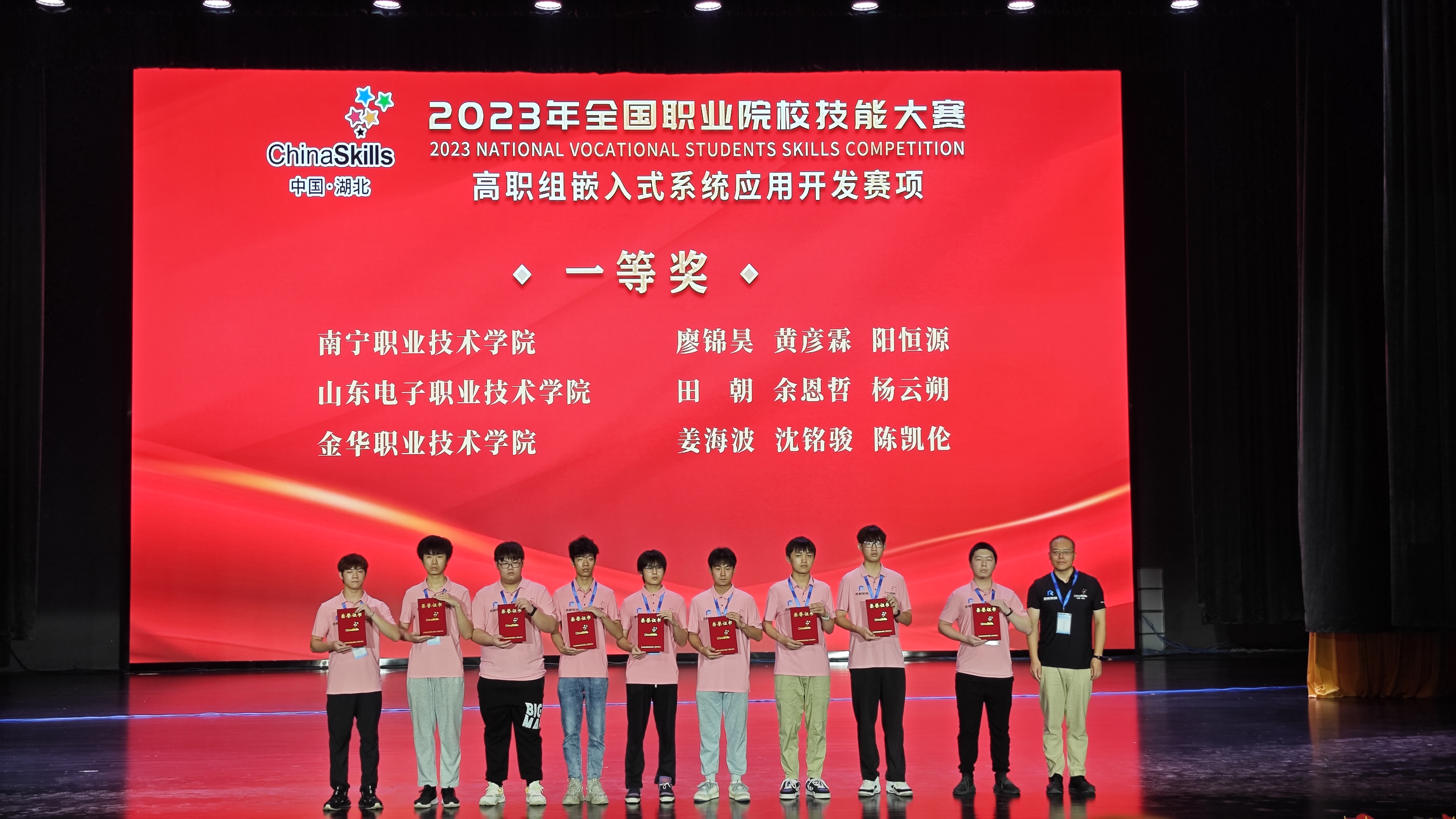 8月4日至5日,2023年全国职业院校技能大赛高职组“嵌入式系统应用开发”赛项在湖北工程职业学院举行,共有来自全国30个省市自治区的69支队伍共207名选手参赛。经过两天的激烈角逐,由金华职业技术学院信息工程学院(怀卡托国际学院)范灵芝、刘子坚2位教师指导,姜海波、沈铭骏、陈凯伦3位同学组成的参赛队伍,凭借扎实的专业功底,在赛场上沉着应对、稳定发挥,最终以排名第三的好成绩斩获比赛一等奖。