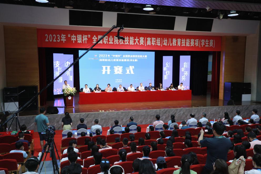 8月19日,2023年“中银杯”全国职业院校技能大赛高职组幼儿教育技能赛项学生赛在金华职业技术学院隆重开幕。金华市副市长庄凌飞,浙江省教育厅职成教处二级调研员祝鸿平,天津现代职业技术学院原党委书记李国桢,中国银行金华市分行副行长陈剑,幼乐美(北京)教育科技有限公司总经理田久民,金职院院长梁克东、总督学成军,赛项专家组长、裁判长、监督仲裁长、特邀嘉宾,各省、自治区、直辖市和新疆生产建设兵团的领队、指导老师、参赛选手等300余人出席了开赛式。梁克东、祝鸿平先后为大赛致辞,庄凌飞宣布开赛。开赛式由金职院副院长张雁平主持。