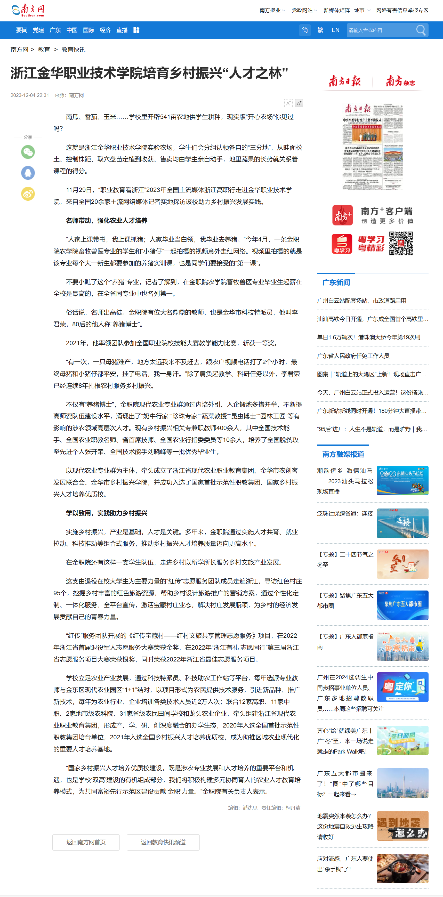 南方网:浙江金华职业技术学院培育乡村振兴“人才之林”