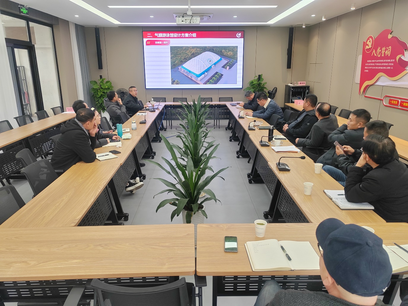 会上,项目投资方浙江金华航投新能源有限公司的技术工程师详细汇报了项目总体方案概况,展示校园体育场馆设计效果图以及设备配套参数等。随后,参会人员针对场馆外观设计、消防管道和空调系统改造等方面提出整改意见,并要求作进一步的方案设计整改。本项目预计2024年1月中旬进场施工,于2024年5月投入初步试运行。
