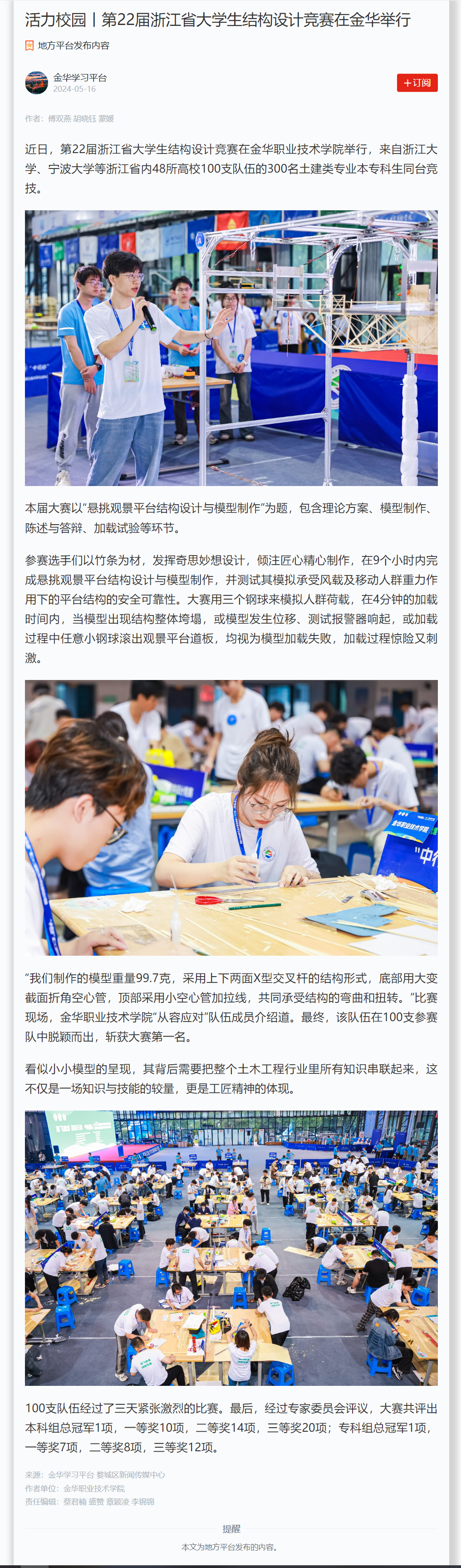 学习强国 金华学习平台:活力校园丨第22届浙江省大学生结构设计竞赛在金华举行