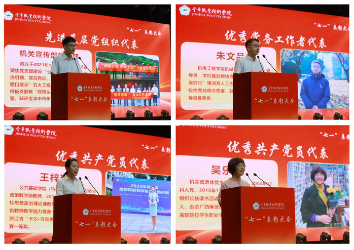 先进基层党组织代表、机关宣传部党支部支部书记卜晓斌,优秀党务工作者、机电工程学院机械党支部宣传委员朱文品,优秀共产党员代表、公共基础学院(马克思主义学院)形势与政策教学部教师王梓君,优秀共产党员代表、机关党委退休教师吴乐央分别进行了交流发言。