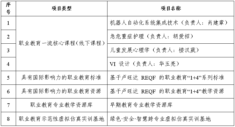 其中,“机器人自动化系统集成技术”“急危重症护理”“儿童发展心理学”“VI 设计”入选职业教育一流核心课程;“基于卢旺达REQF的职业教育“1+4”系列标准”入选具有国际影响力的职业教育标准;“基于卢旺达REQF的职业教育“1+4”教学资源”入选具有国际影响力的职业教育资源;“早期教育专业教学资源库”入选职业教育专业教学资源库;“绿色·安全·智慧跨专业虚拟仿真实训基地”入选职业教育示范性虚拟仿真实训基地。