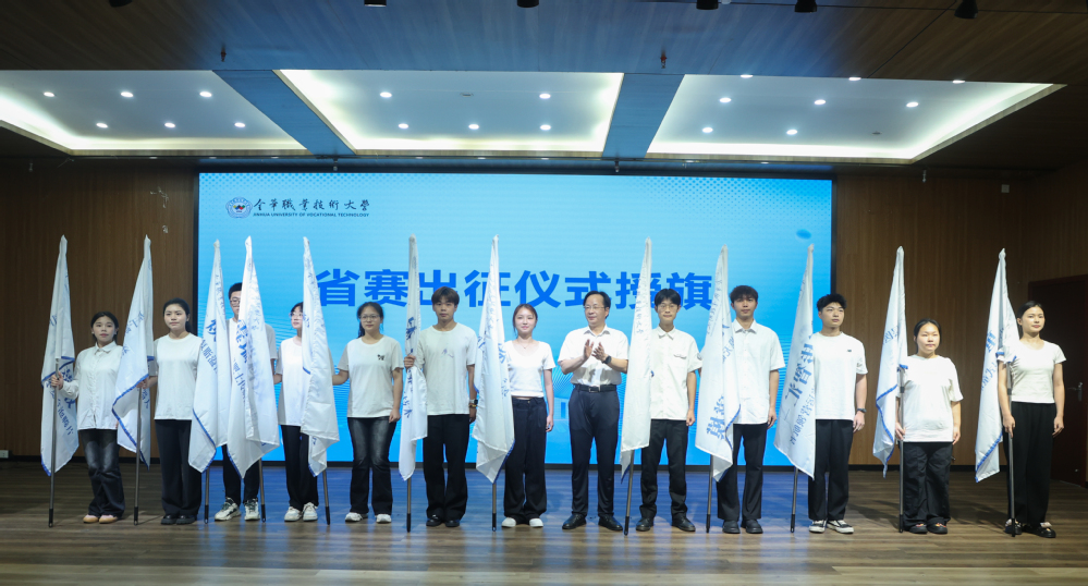 王振洪向入围决赛的团队和指导老师表示热烈祝贺,为12支入围省决赛的团队授旗,寄语各竞赛团队作为金华职业技术大学派出的第一批竞赛团队,积极备赛,在本届国际创新创业盛会中展现金职大的新形象、新风采、新成绩。