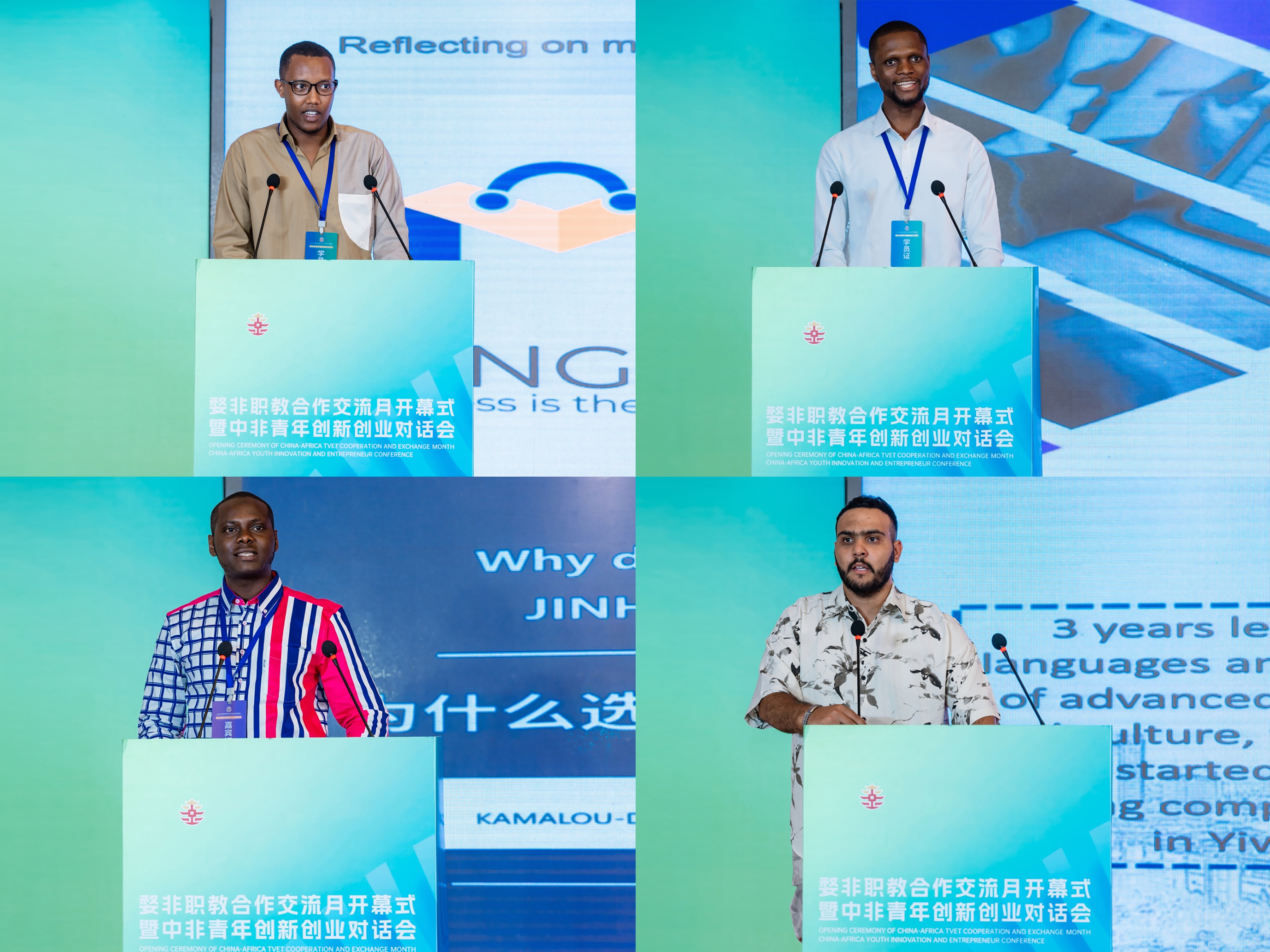在分享交流环节,金华职业技术大学卢旺达校友MUTANGANA JEAN DE DIEU、浙江广厦建设职业技术大学刚果(布)学生MILANDOU MINOU POULASSI、义乌工商职业技术学院的贝宁学生KAMALOU-DING ADISSA AKINOCHO和摩洛哥校友ASMOUN ZAKARIA作了创新创业经验分享,并与现场其他非洲青年进行了互动交流。