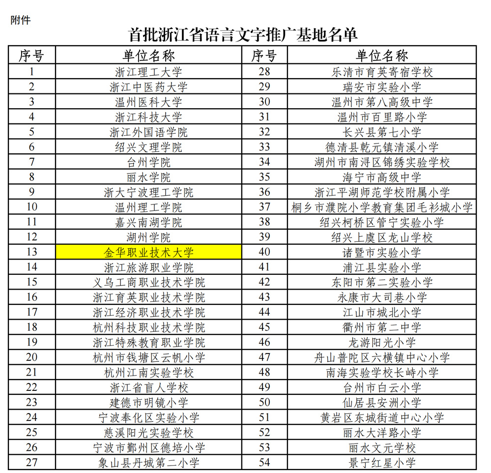 近日,浙江省教育厅公布了首批浙江省语言文字推广基地名单,金华职业技术大学语言文字推广基地成功入选。