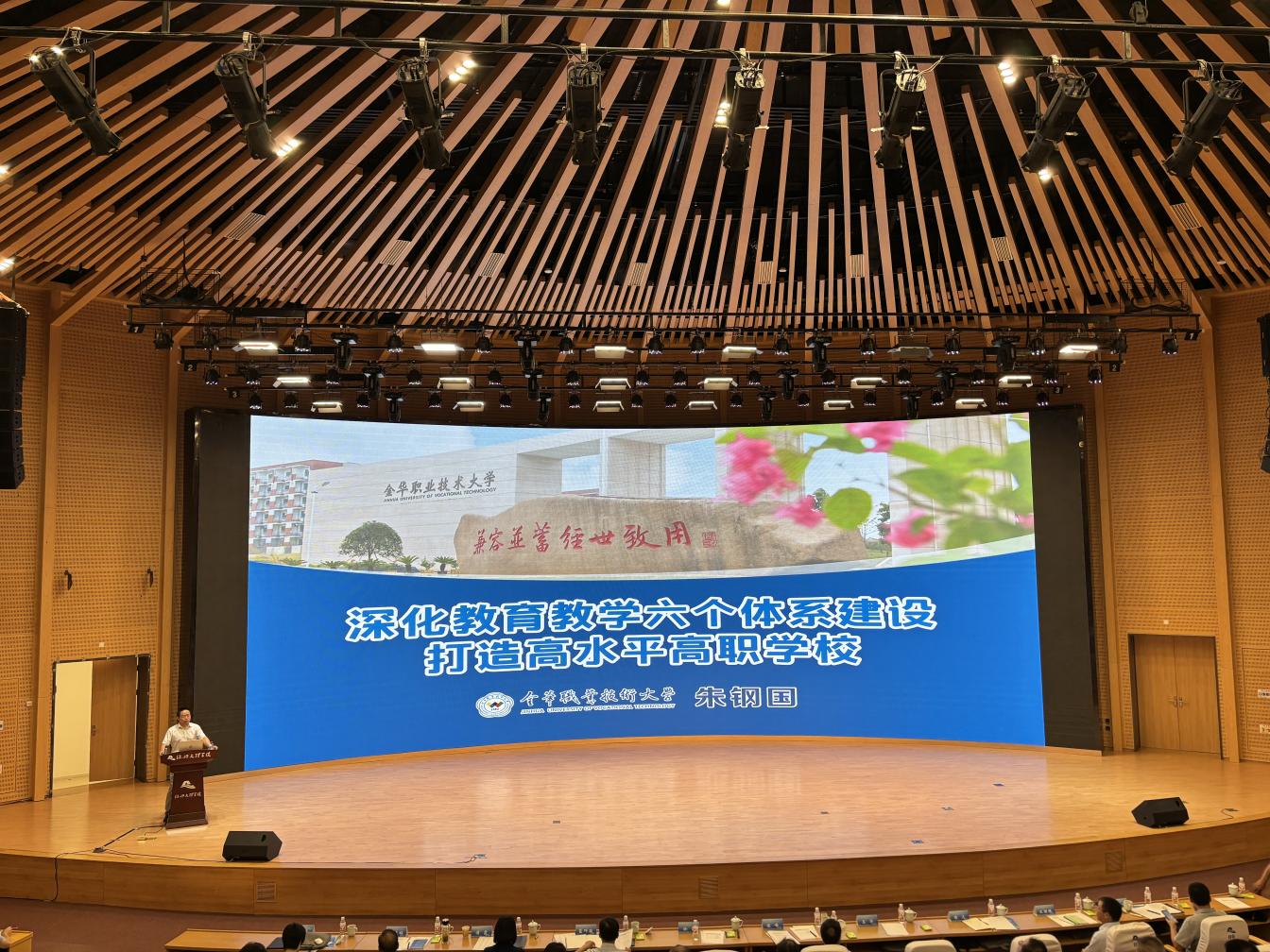 会上,金华职业技术大学副校长朱钢国作题为《深化教育教学六个体系建设,打造高水平高职学校》的主题报告,从优化循产建群的区域服务型专业体系、创新跨界协同的一体化人才培养体系、打造深度融合的实体化产教平台体系、深化迭代改革的新技术课程教改体系、健全分层分类的双师型教师发展体系、构建诊断改进的全过程质量保证体系6个维度介绍了学校教育教学方面的经验和做法。