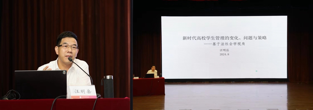 会议还邀请到了浙江省团校教研部副主任、浙江财经大学法学院兼职教授汪明岳老师,为大家作关于“新时代高校学生管理的变化、问题与策略”的讲座。汪明岳从七个典型案例说起,分析了新时代高校学生管理的新情况,从法律的专业角度阐述了涉及学生工作相关问题的处理策略,为学工队伍处理学生工作实际问题提供了诸多思考和启发。