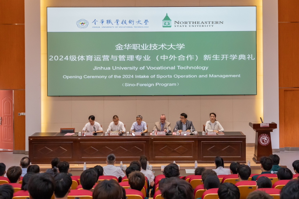 9月24日下午,金华职业技术大学与美国东北州立大学合作举办的体育运营与管理专业高等专科教育项目2024级新生开学典礼在师范学院西教2-416报告厅顺利举行。