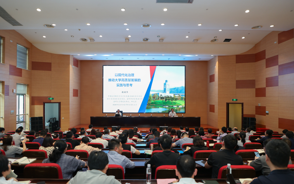 会议还邀请到了中国高等教育学会学术发展咨询委员会委员、浙江省咨询委员会委员、温州市决咨委副主任、温州大学原党委书记、研究员谢树华作《以现代化治理推动大学高质量发展的实践与思考》专题报告。谢树华结合学习党的二十届三中全会精神体会,以温州大学发展的实践经验为引,从“明确办学定位 统领发展方向”“锚定奋斗目标 凝聚发展共识”“实施综合改革 激发发展动力”“强化内涵建设 推动高质量发展”等四个方面进行了经验分享。