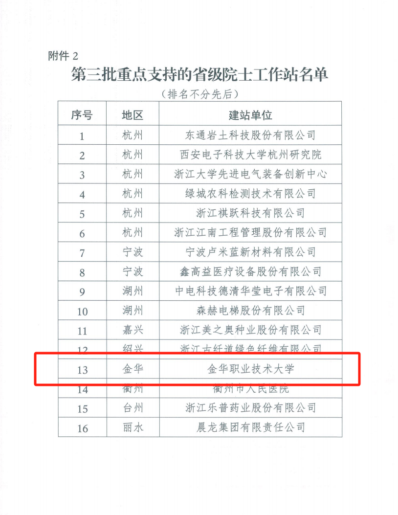 近日,浙江省院士专家工作站协调小组办公室发布了《浙江省第三批重点支持的省级院士工作站名单》,金华职业技术大学汪卫华院士工作站榜上有名,成功被认定为浙江省重点支持的院士工作站,学校也是全省高校唯一入选的建站单位。