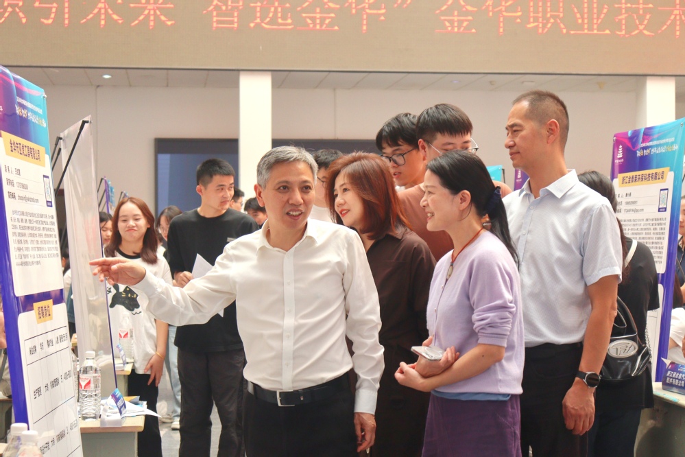 “你好,我是金职大商学院市场营销专业的毕业生,想应聘贵公司外贸业务员,这是我的简历。” 10月17日,“职引未来 智选金华”2025届金华职业技术大学金秋校招活动顺利举办。本场招聘会由金华市人力资源和社会保障局(以下简称“市人社局”)、金职大联合主办,市人才服务和人事考试中心、学校就业指导处承办,旨在搭建毕业生与企业交流的平台,促进留金就业供需精准对接。校长梁克东莅临现场指导,与用人单位、毕业生交流,深入了解在金企业面向学校发布的岗位质量以及往届毕业生在企业的发展情况。