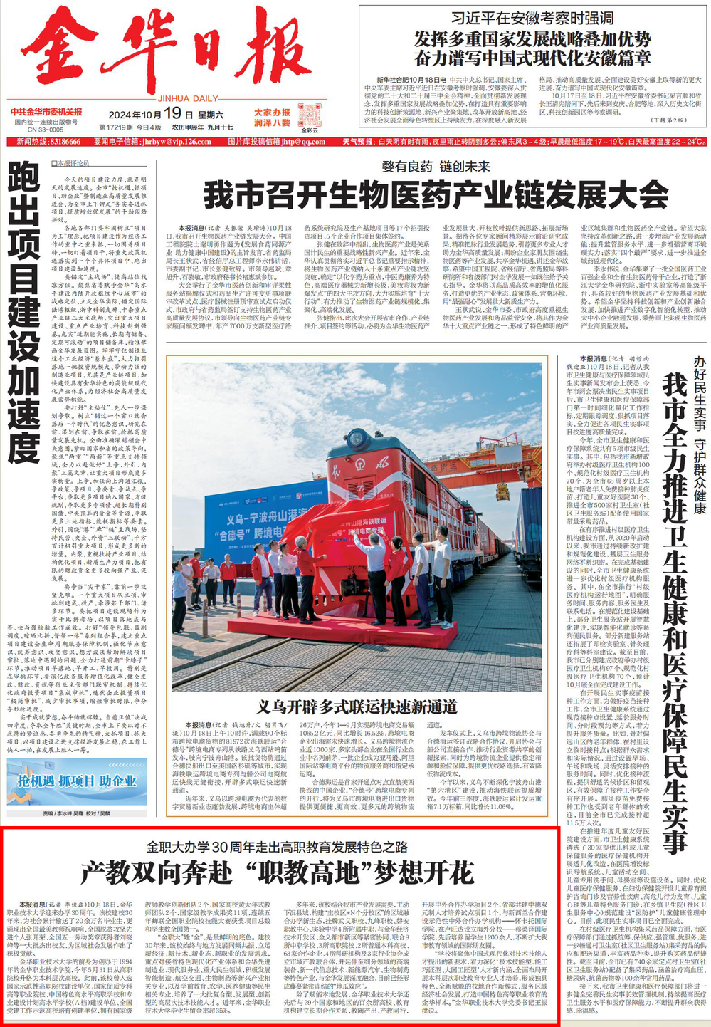 10月19日,《金华日报》头版刊发了《金职大办学30周年走出高职教育发展特色之路:产教双向奔赴 “职教高地”梦想开花》,金华新闻联播报道了金华职业技术大学举行高职教育30周年暨高质量发展研讨会。