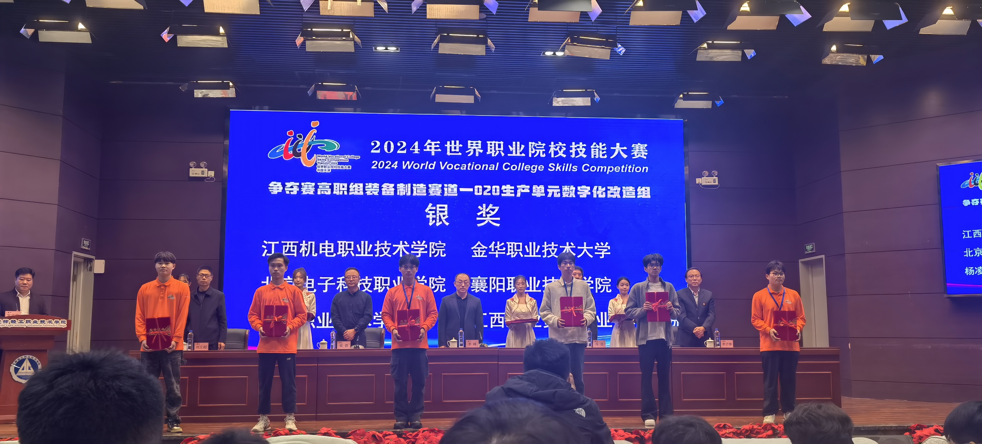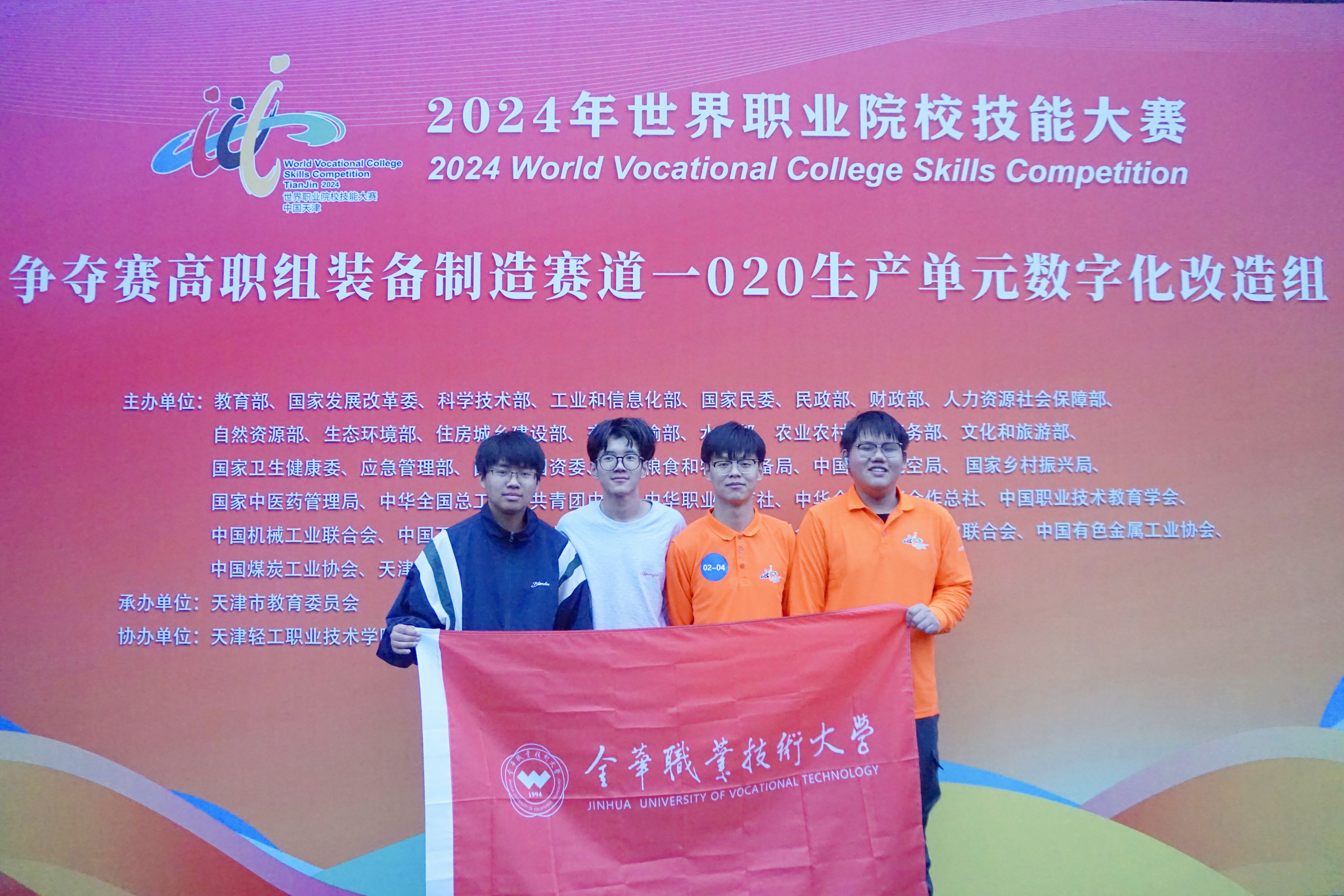 10月29日至10月31日,2024年世界职业院校技能大赛争夺赛高职组装备制造赛道一“生产单元数字化改造”小组于天津市天津轻工职业学院举办。来自全国各地60个参赛队展开了激烈的角逐。由金华职业技术大学智能制造学院、航空工程学院阙献书、高宁两位教师指导,周俊豪、祁程、张梓豪、史旭豪组成的参赛团队荣获比赛银奖。