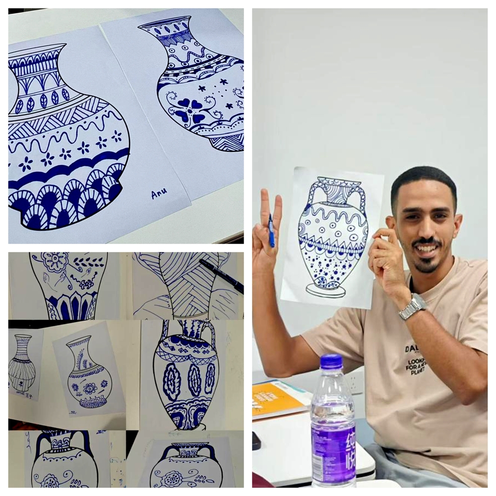 两个多小时的活动里,没有枯燥的理论讲解,只有“听、看、做、悟”的深度互动。一位留学生在体验后感慨:“以前读‘白釉青花一火成’只觉得是句诗,今天亲手画了青花,才懂这句诗里蕴含的工艺与审美。”活动结束后,同学们纷纷展示自己的独特作品。这场活动不仅是一次汉语言帮扶,更是一次文化审美的启蒙,让传统不再是书本里的文字,而是可听、可触、可创造的生活美学。