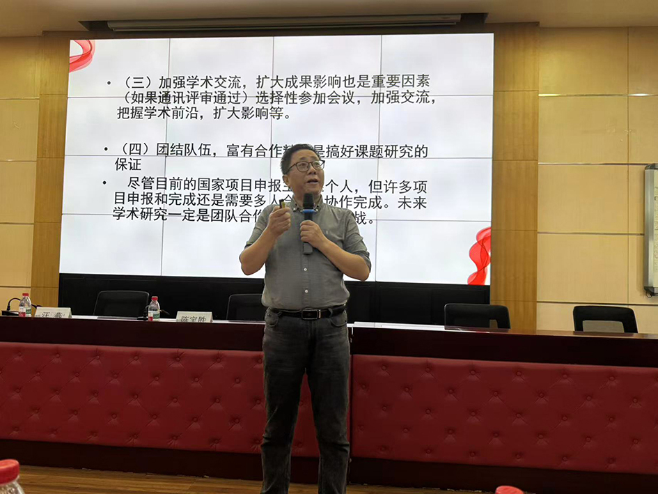 随后,陈宝胜教授深入剖析了项目申报成功的核心要素。他强调,持续深入开展科学研究、积累扎实的前期成果是项目申报的重要前提,只有具备深厚的研究基础,才能在申报中展现出项目的可行性与创新性;与国家社会发展需求相契合的相对稳定的研究领域和方向,是项目获得评审认可的关键基础,需紧密结合时代发展痛点与重点,确保研究具有现实意义与应用价值;此外,加强学术交流、扩大成果影响力也不可或缺,通讯评审通过后,可选择性参加高水平学术会议,及时把握学术前沿动态,提升自身的知名度与认可度;而团结协作的研究队伍、富有合作精神,则是保障课题研究顺利推进的重要支撑。