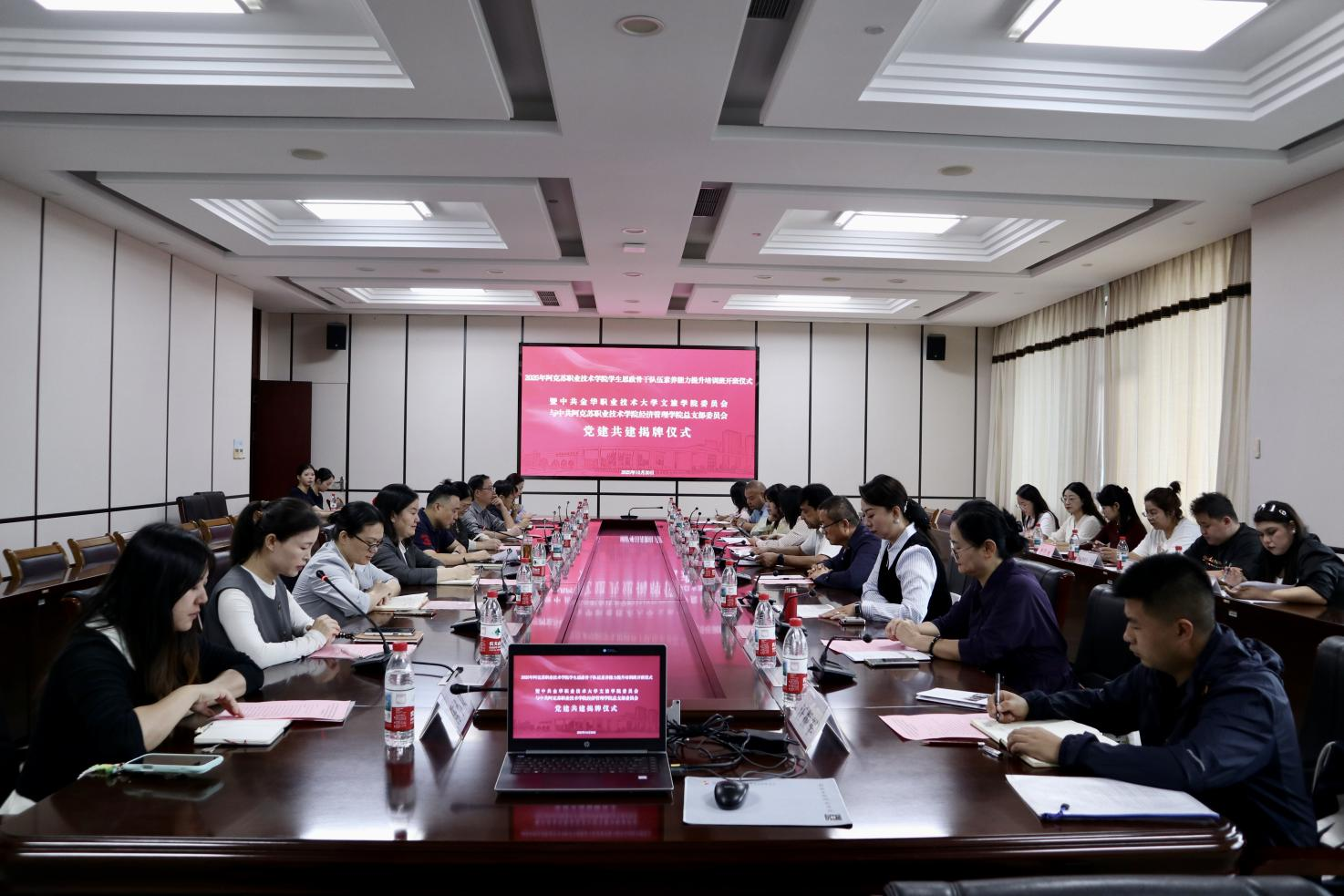 10月20日,2025年阿克苏职业技术学院学生思政骨干队伍素养能力提升培训开班仪式暨中共金华职业技术大学文旅学院委员会与中共阿克苏职业技术学院经济管理学院总支部委员会党建共建揭牌仪式在明理会议室举行。校党委委员、组织部部长董晓晨,阿克苏职业技术学院副院长安尼瓦尔·阿布都热合曼,金职大相关职能部门负责人、文旅学院领导班子成员,阿克苏职业技术学院教师代表共同参加。