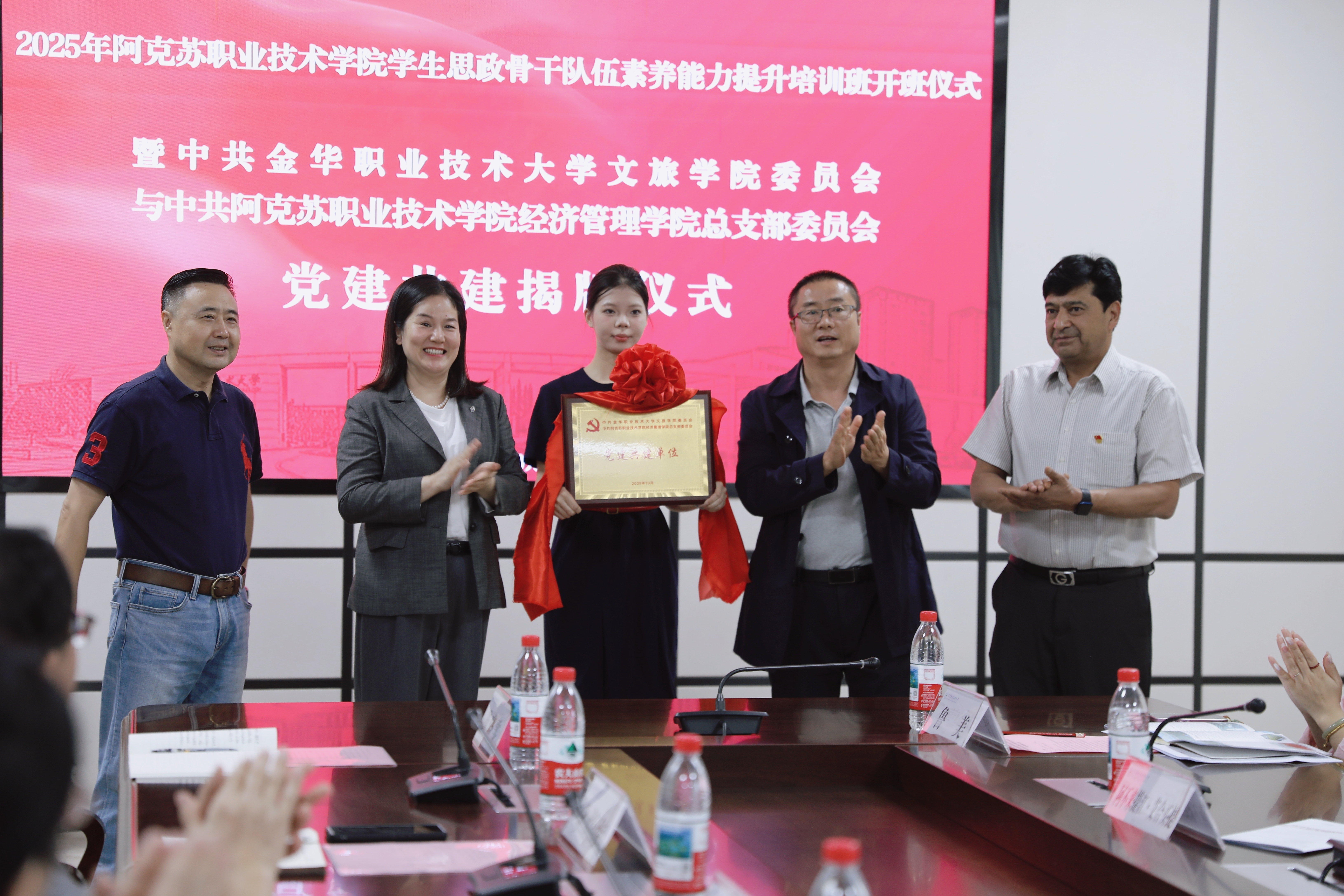在与会人员的共同见证下,董晓晨、安尼瓦尔・阿布都热合曼、索奕双、张军华共同为“中共金华职业技术大学文旅学院委员会与中共阿克苏职业技术学院经济管理学院总支部委员会党建共建”揭牌。