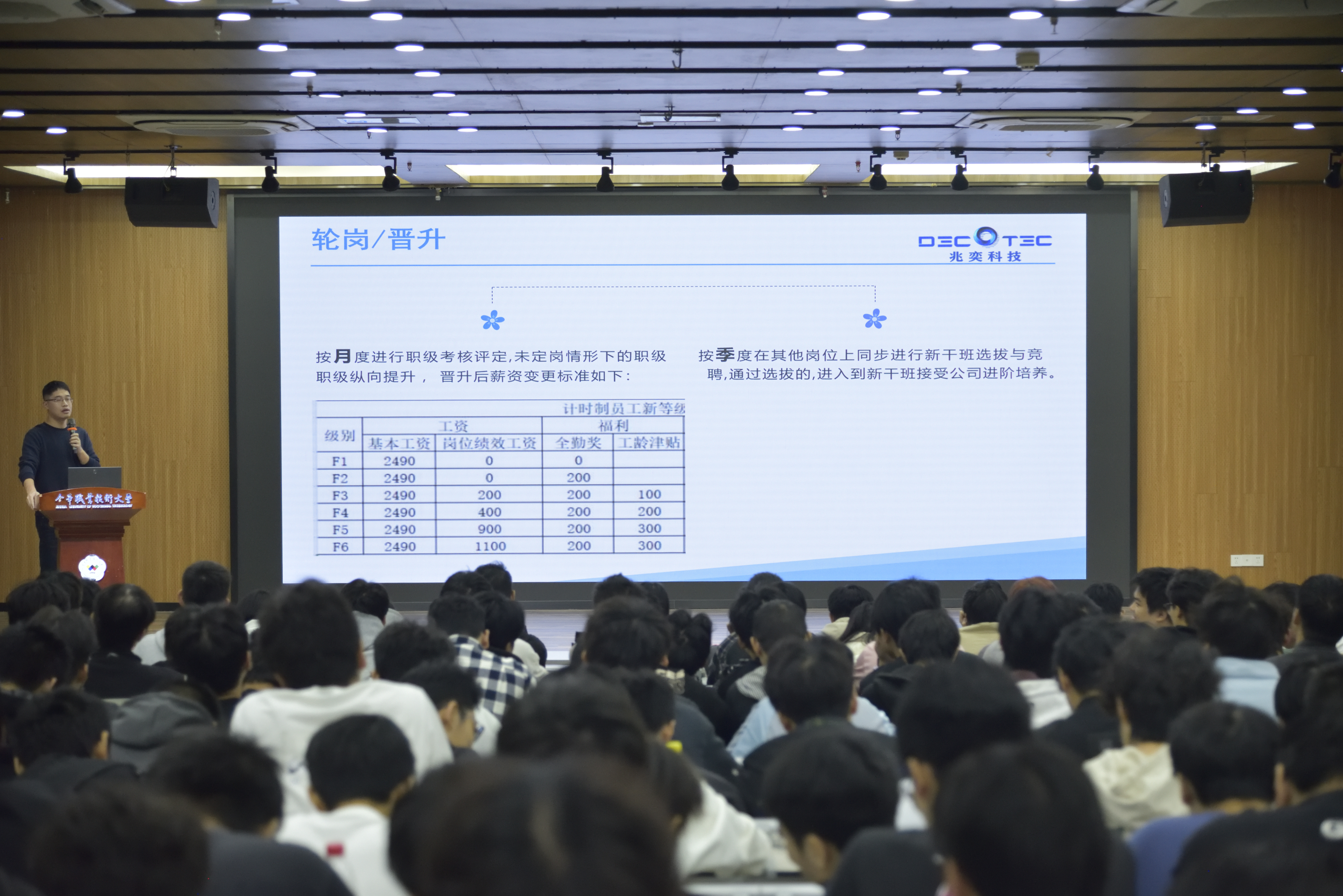 第二场宣讲会由国有控股的行业领军企业——杭州富芯半导体有限公司接棒登场。宣讲会上,企业招聘负责人系统介绍了公司的国资背景、在国家集成电路产业战略中的地位以及领先的技术优势。企业所提供的稳定职业发展通道、完善保障体系和参与国家重大项目的宝贵机会,深深吸引了众多渴望在关键领域建功立业的学子。本场宣讲让同学们深刻认识到,投身于这样的“国之重器”企业,不仅能够实现个人职业理想,更能将个人发展融入国家战略,肩负起新时代智能制造人才的光荣使命。