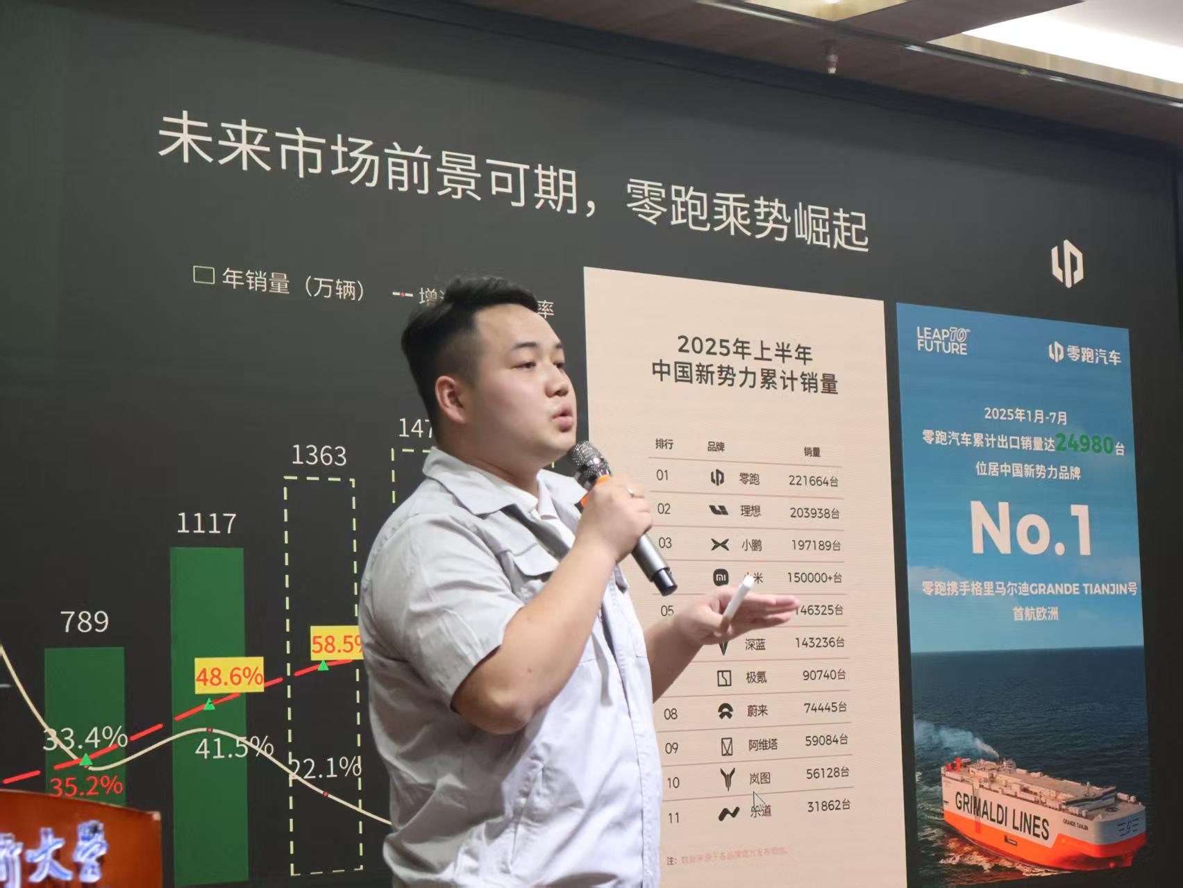 第三场宣讲会迎来了植根本地的行业新锐——零跑汽车有限公司。企业代表在宣讲中生动阐释了其在新能源汽车领域的创新活力、全生态产业链布局。他指出,为系统培养新生力量,企业重点推出了“青苗计划”,通过计划帮助新员工深入掌握制造工艺精髓。企业还特别表达了对本土人才的迫切需求,作为“金华人自己的车企”,非常欢迎学院优秀学子的加入,共同助力家乡“先进制造业崛起”。这场充满家乡情怀的宣讲引起了学子们的强烈共鸣,许多同学表示,能够在家门口的国际化知名科技企业实现就业,助力家乡产业升级,是实现个人理想与服务区域发展相结合的宝贵机遇。