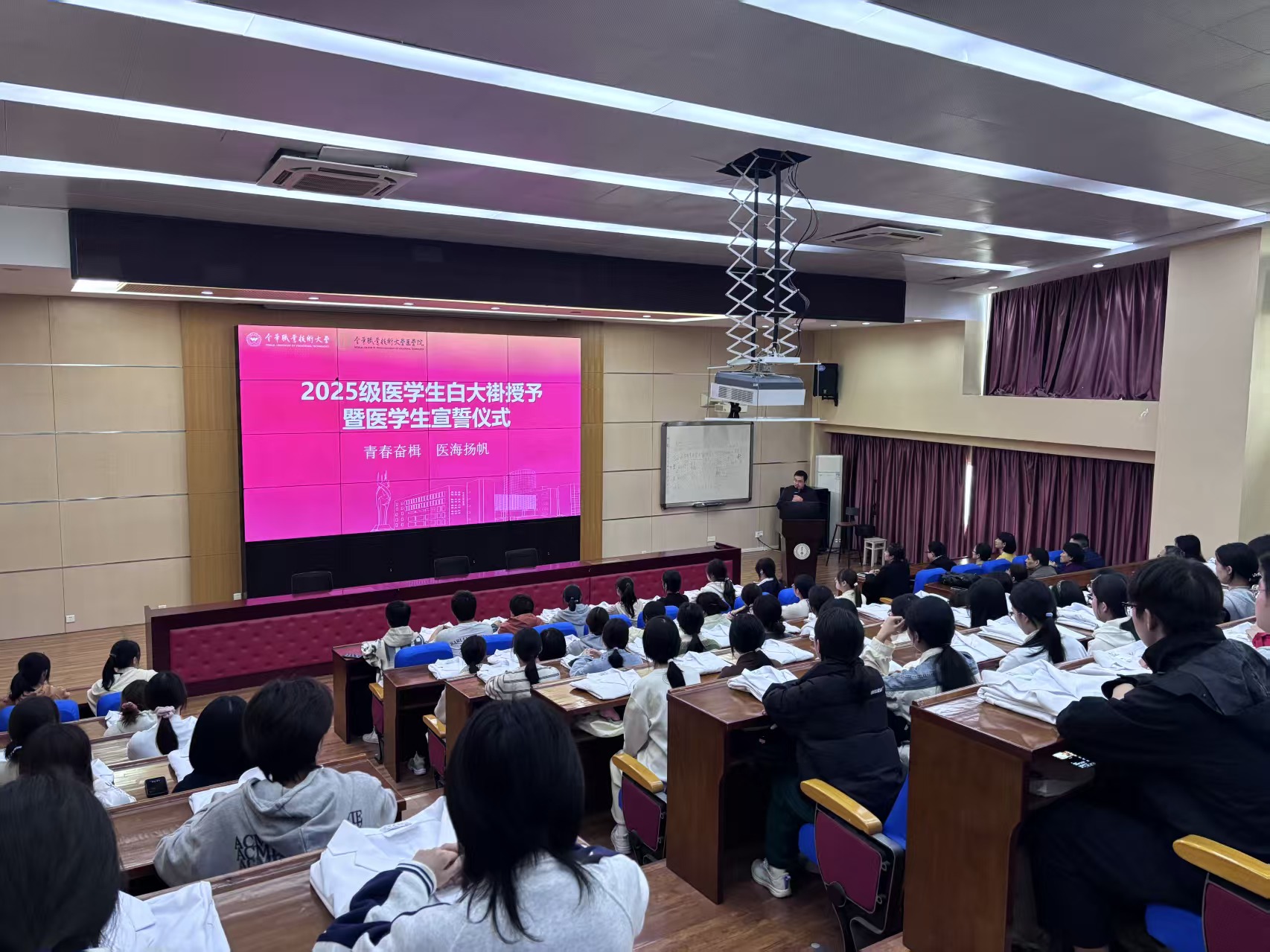 仪式在庄严的国歌声中拉开帷幕。隆重的白大褂授予仪式正式开启。这是一项庄严而神圣的仪式,白大褂象征着医者身份,承载着职业责任。穿上它,意味着今后要努力夯实医学知识、锤炼临床技能、培养良好医德。学生们依次上台,在临床医学专业和附属医院教师代表们的帮助下郑重穿上白大褂,扣好医学路上的第一颗扣子。