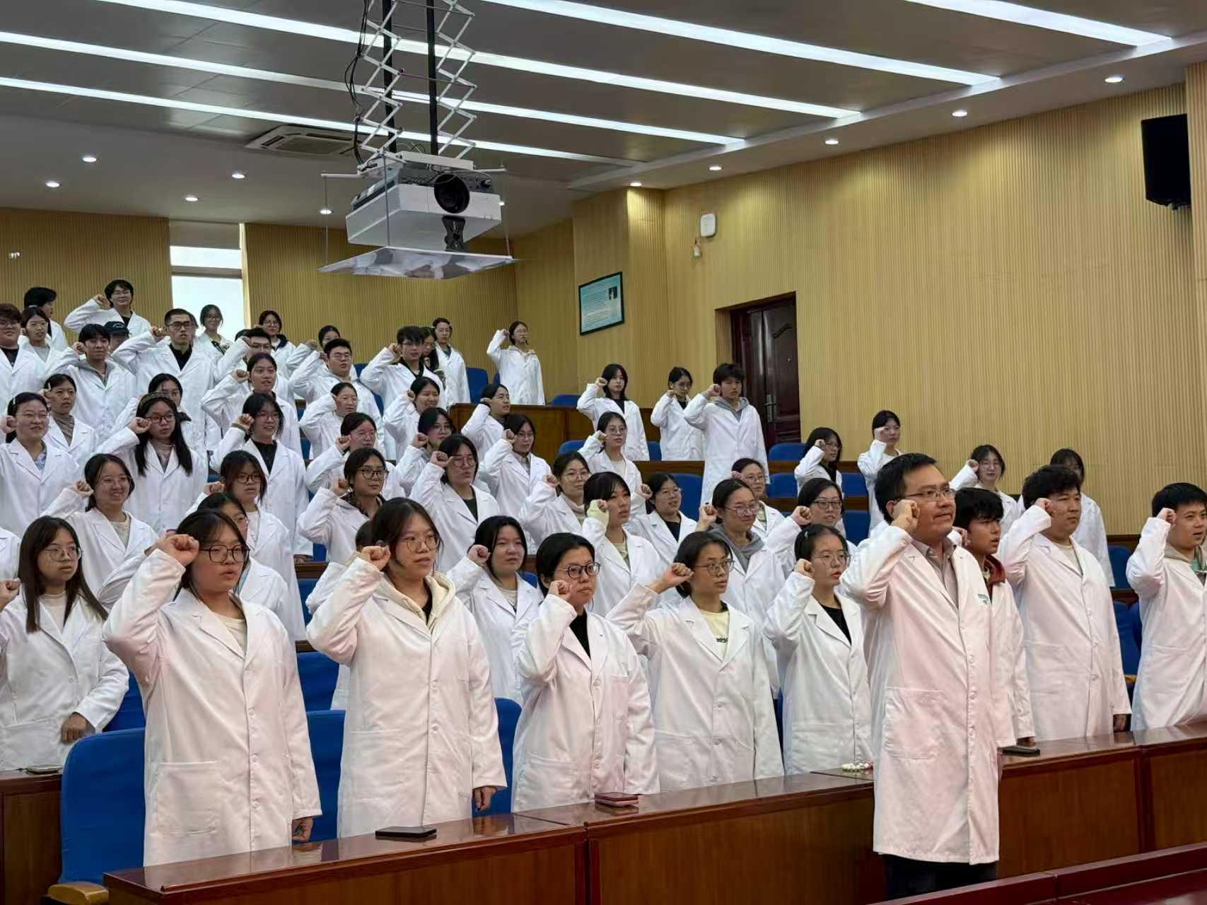 在医路康行党支部副书记的带领下,全体新生高举右拳、庄严宣誓,铿锵誓言响彻会场,展现了新一代金职医学生的坚定信念。“健康所系,性命相托。当我步入神圣医学学府的时刻,谨庄严宣誓:我志愿献身医学……”誓言铮铮,掷地有声,全体同学庄严宣誓,许下对生命的敬畏和对医学事业的热爱。