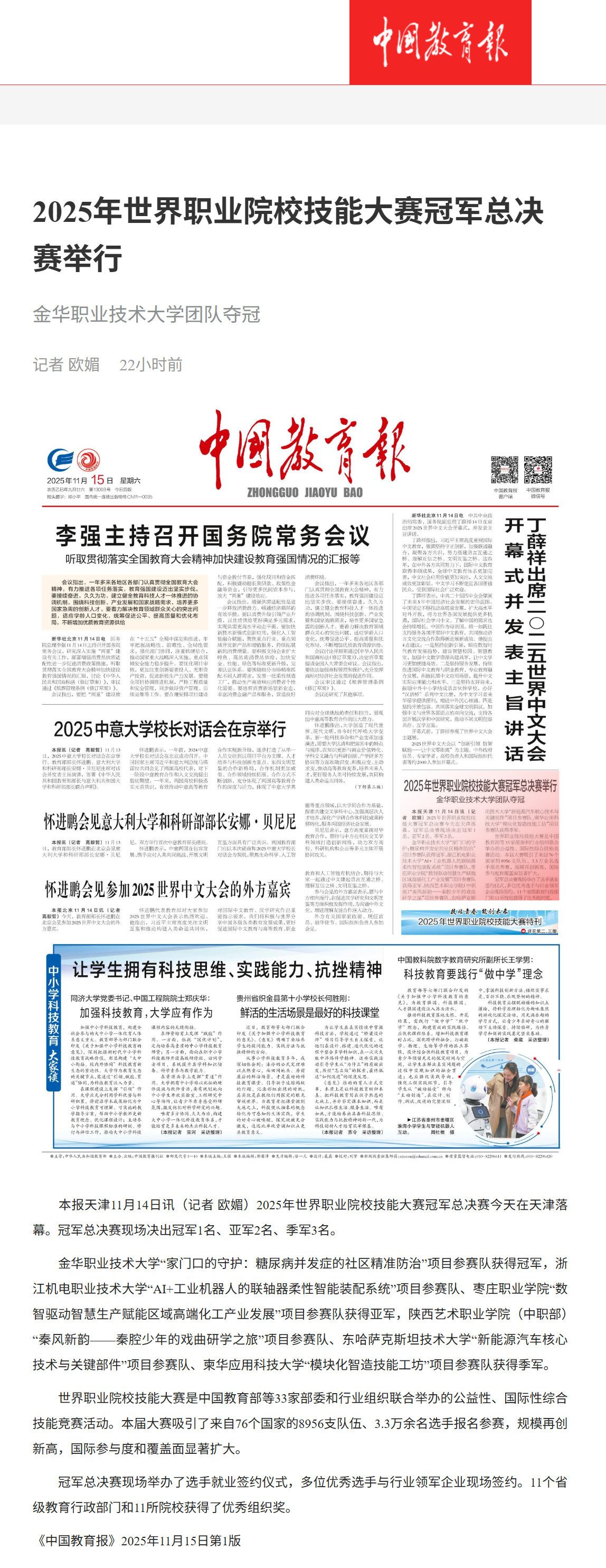 中国教育报:2025年世界职业院校技能大赛冠军总决赛举行