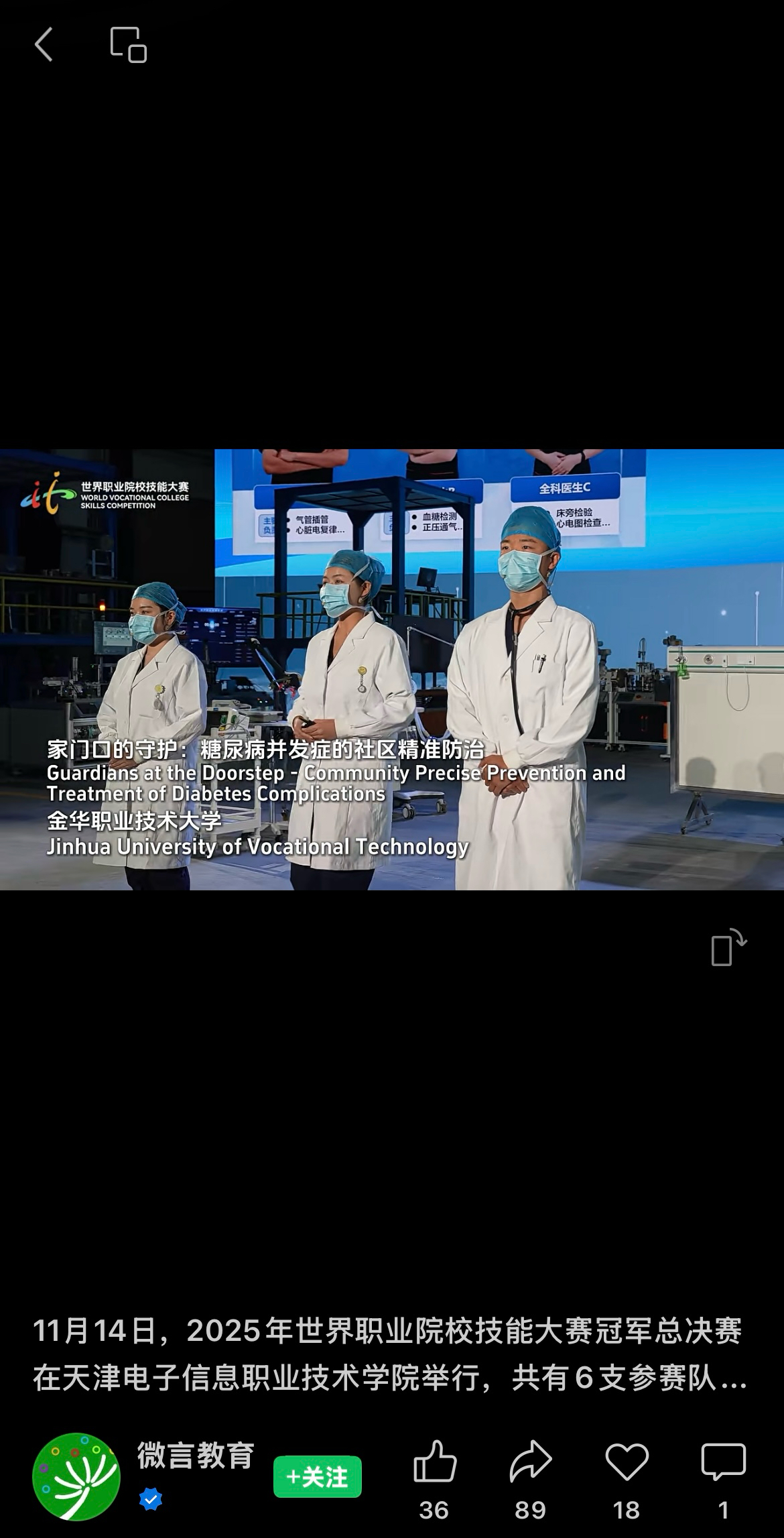 微言教育视频号:11月14日,2025年世界职业院校技能大赛冠军总决赛在天津电子信息职业技术学院举行,共有6支参赛队伍进入冠军总决赛。跟随视频,一起来看金华职业技术大学参赛团队的比赛风采→