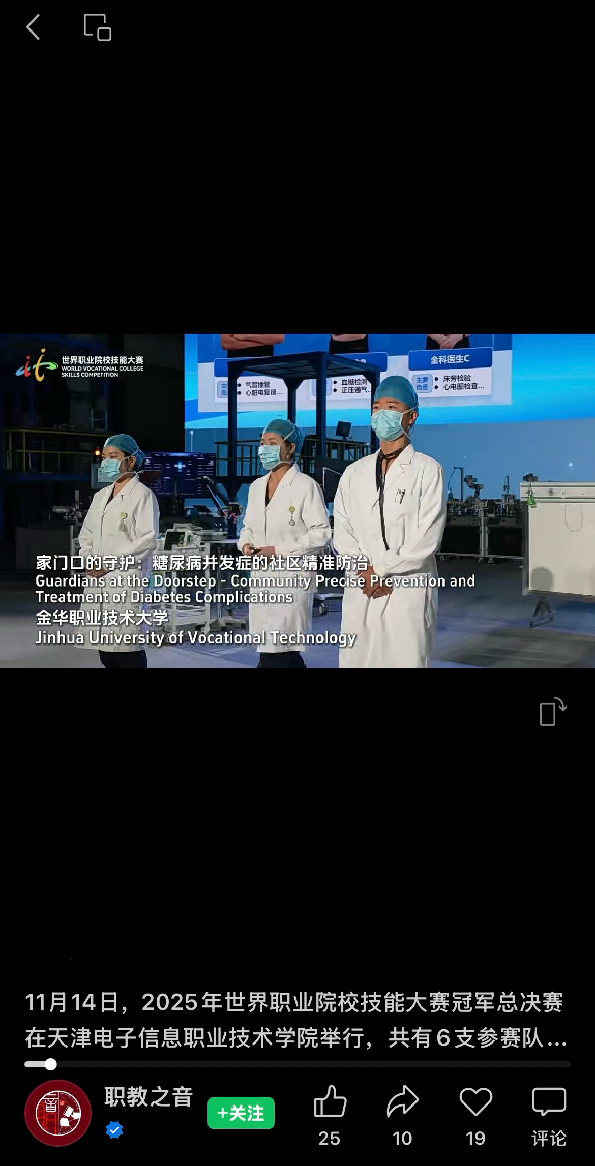 职教之音视频号:11月14日,2025年世界职业院校技能大赛冠军总决赛在天津电子信息职业技术学院举行,共有6支参赛队伍进入冠军总决赛。跟随视频,一起来看金华职业技术大学参赛团队的比赛风采→