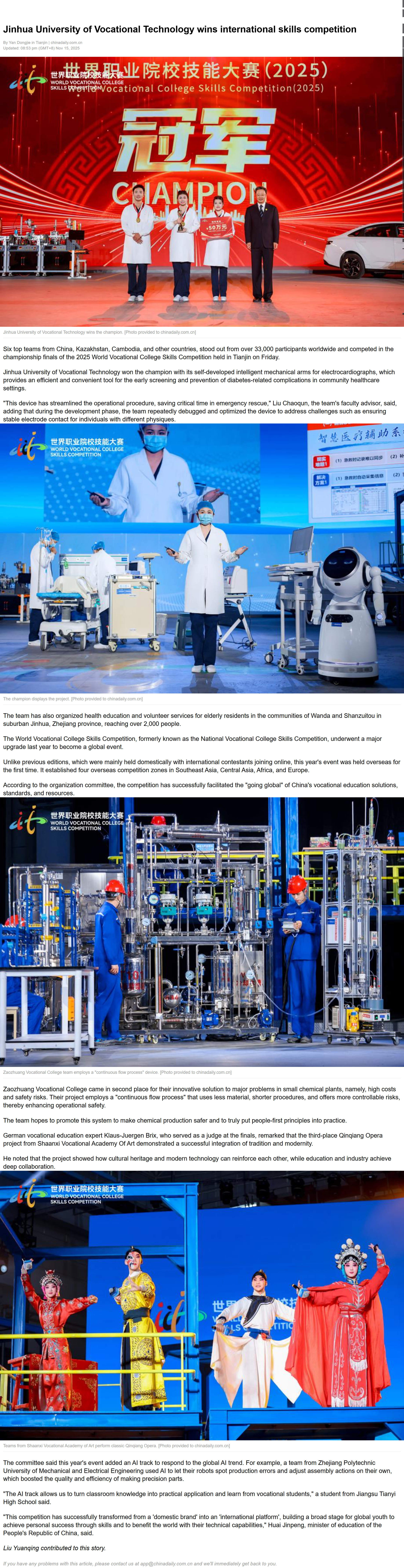 中国日报客户端:Jinhua University of Vocational Technology wins international skills competition