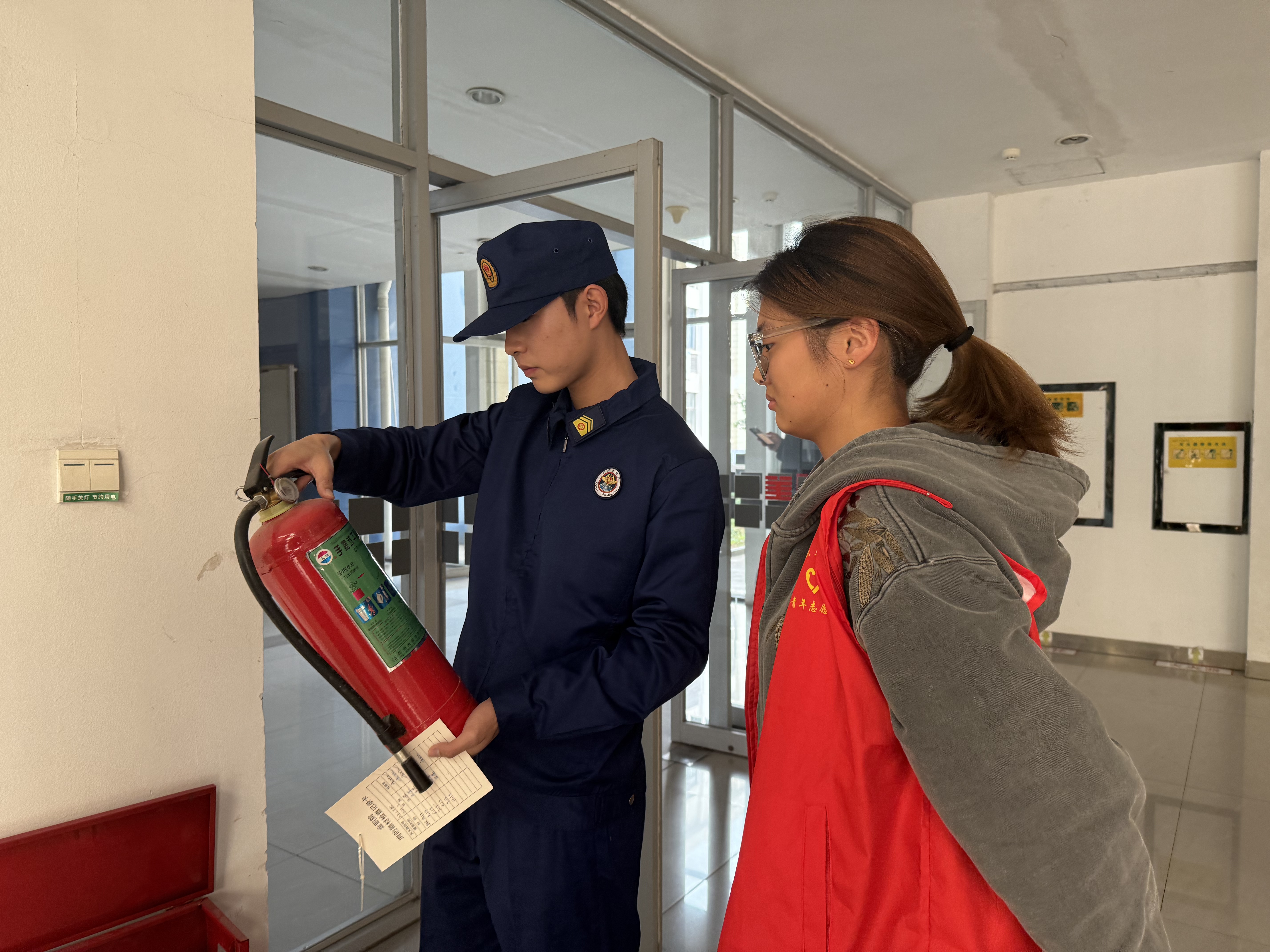 回到最熟悉的校园,叶俞骏对曾经的教学楼和“一站式”学生社区都做了详细的检查,逐一指明其中存在的潜在隐患。与此同时,他还对灭火器、消防栓等关键设施进行了现场讲解。他俯身示范灭火器的使用步骤,动作熟练且沉稳,在操作的同时着重强调:“提拔握压,这四个步骤不可出错,在关键时刻能够挽救生命。”此外,他提醒同学们要爱护这些“沉默的守护者”,切勿在其下方堆放杂物或者随意触碰,以便在需要时能够正常使用。