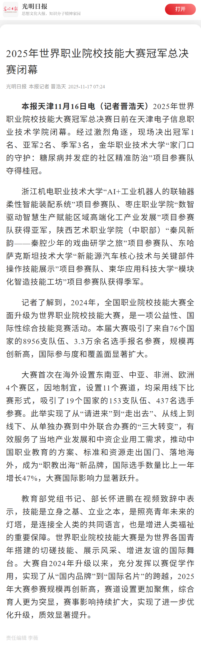 光明日报:2025年世界职业院校技能大赛冠军总决赛闭幕