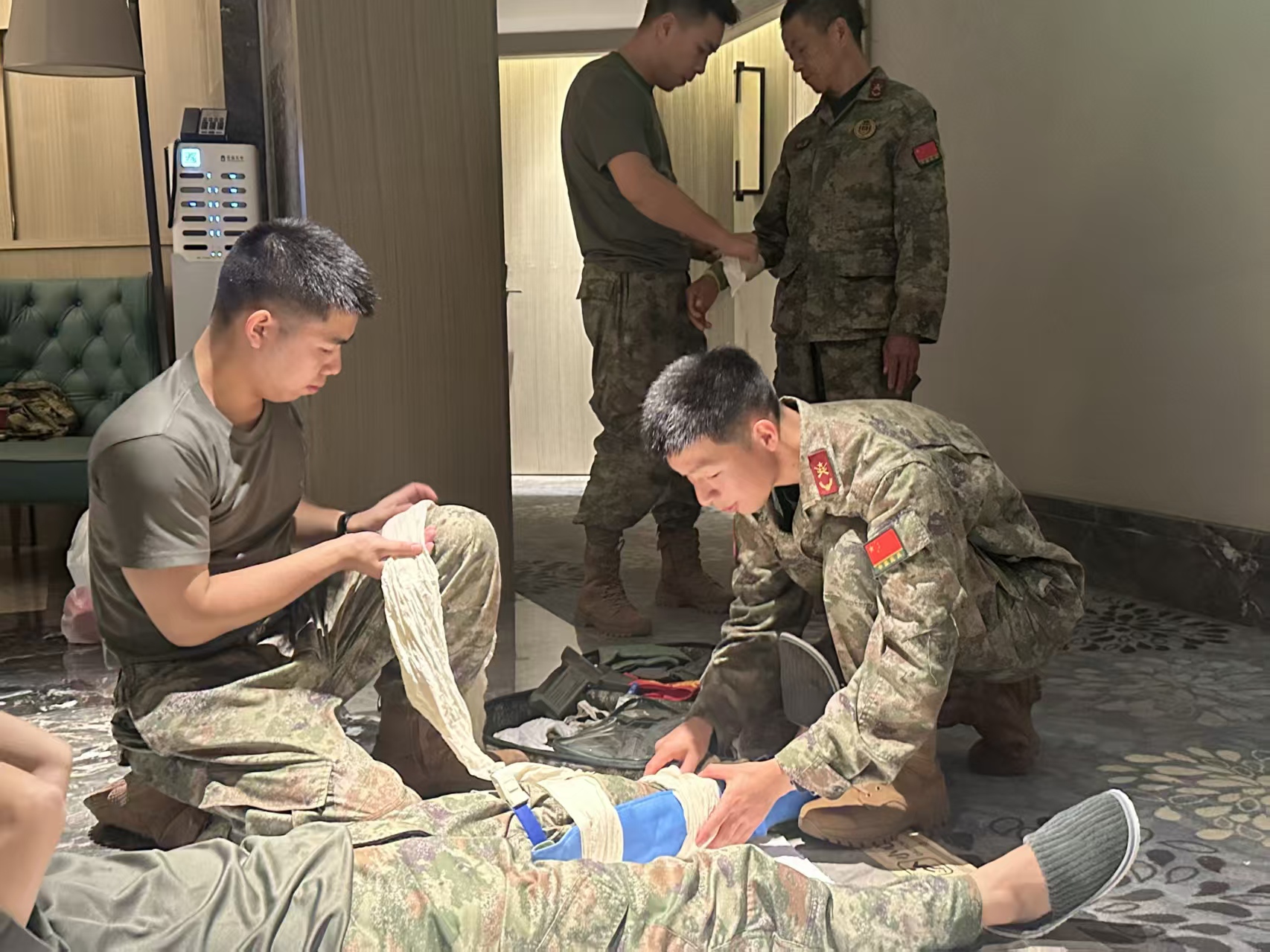功不唐捐,玉汝于成。五位同学利用课余时间,刻苦钻研救护技能,系统学习止血、包扎、固定、搬运等战伤救护全流程,在模拟实战环境下提升应急反应与团队协作能力。从判断伤情、快速施救,到利用担架安全转移“伤员”,每一个环节他们都反复打磨,追求零失误,将战场救护的五大技术熟练转化为肌肉记忆。最终,五位同学获得地面防卫项目第二名、战场救护项目第三名、团体第二名的好成绩。
