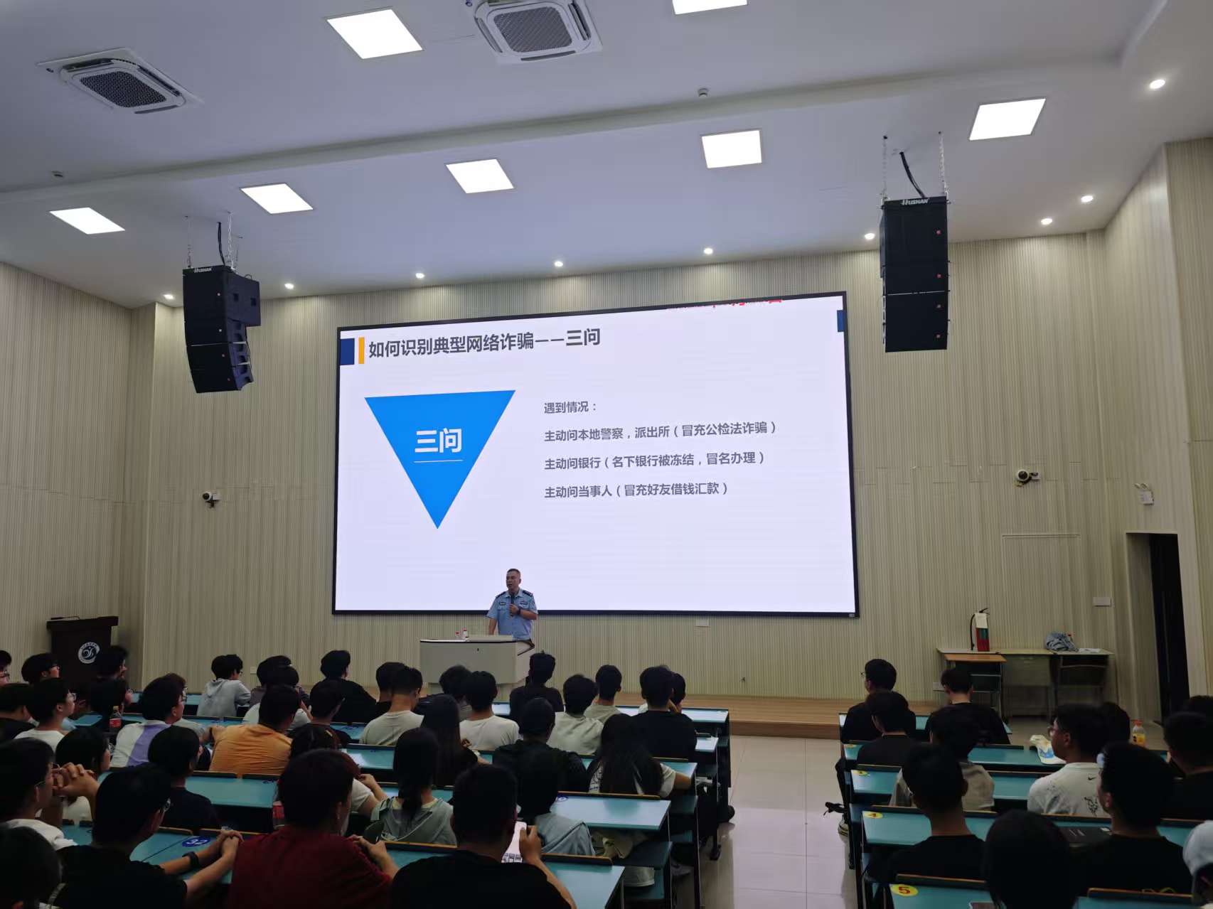 新生报到期间,学院举办首场反诈安全知识集中宣讲。西关派出所民警结合高校多发的网络刷单、冒充客服、游戏账号交易、“杀猪盘”等真实案例,以案释法,深入剖析电信网络诈骗的常见手法与严重危害。他提醒同学们务必谨记“三不一多”原则:未知链接不点击、陌生来电不轻信、个人信息不透露、转账汇款多核实,切实筑牢财产安全“防护盾”。