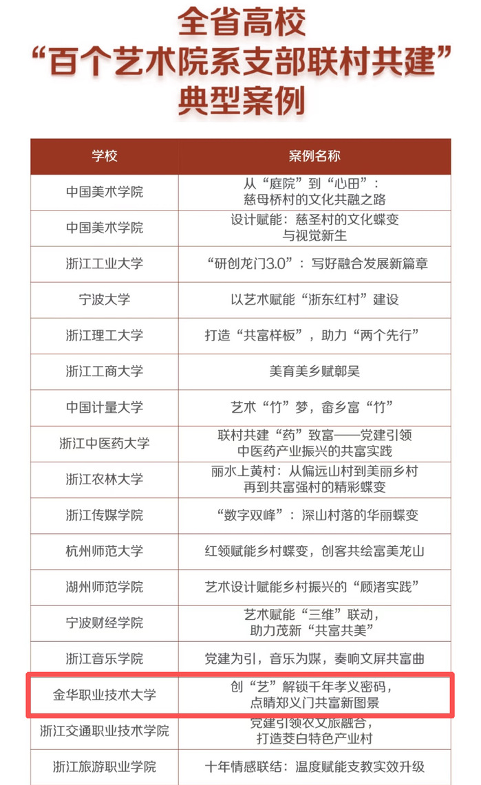 近日,中共浙江省委教育工作委员会办公室发布《关于公布全省高校“百个艺术院系支部联村共建”典型案例的通知》,金华职业技术大学设计学院艺术党支部报送的案例《创“艺”解锁干年孝义密码 点晴郑义门共富新图景》成功入选,成为全省20个典型案例之一。