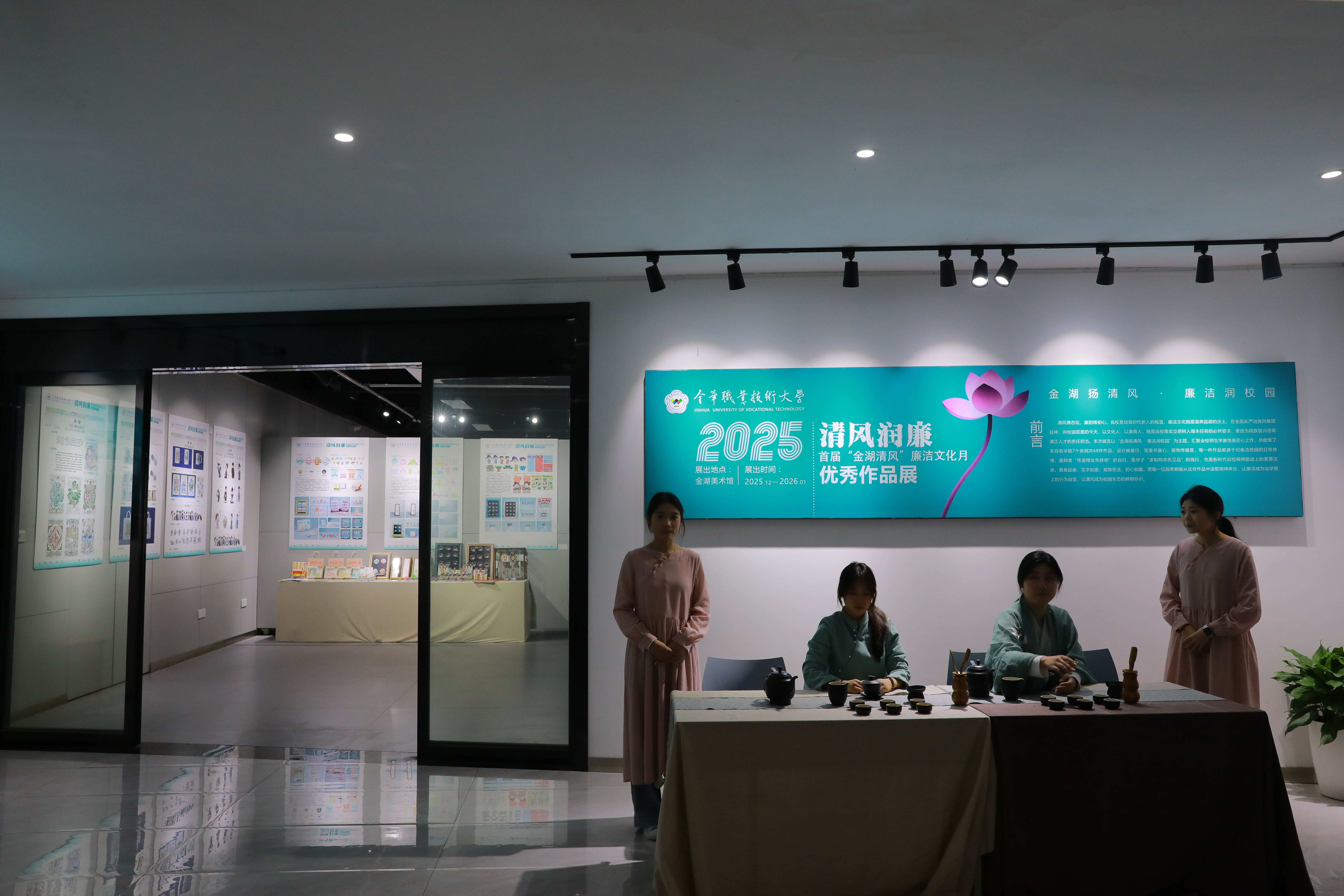 开幕式结束后,参会人员移步金湖美术馆,参观了“清风润廉”优秀作品展。本次展览共设海报、文创、服饰、书画等多个展区,共展出师生创作的优秀廉洁文化作品68件,让廉洁文化在艺术与创意中进一步传递。