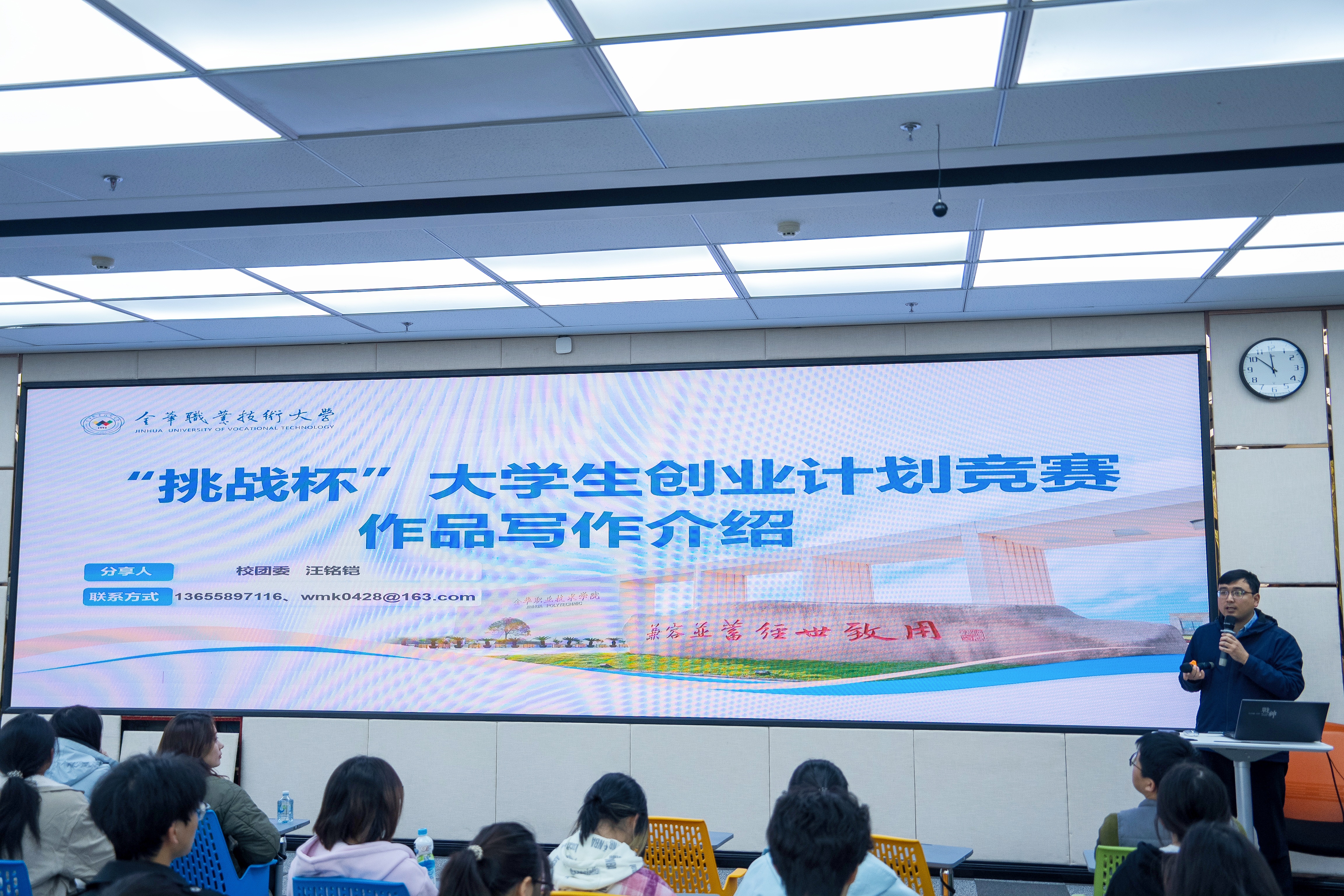 讲座中,主讲人校团委负责人汪铭铠以《“挑战杯”大学生创业计划竞赛作品写作介绍》为题,结合自身赛事的丰富经验,围绕备赛计划通知、优秀案例分享、作品材料准备、文本制作建议、佐证材料清单等点等备赛关键环节展开讲解,既搭建理论框架,又拆解实战案例,内容紧贴备赛需求。