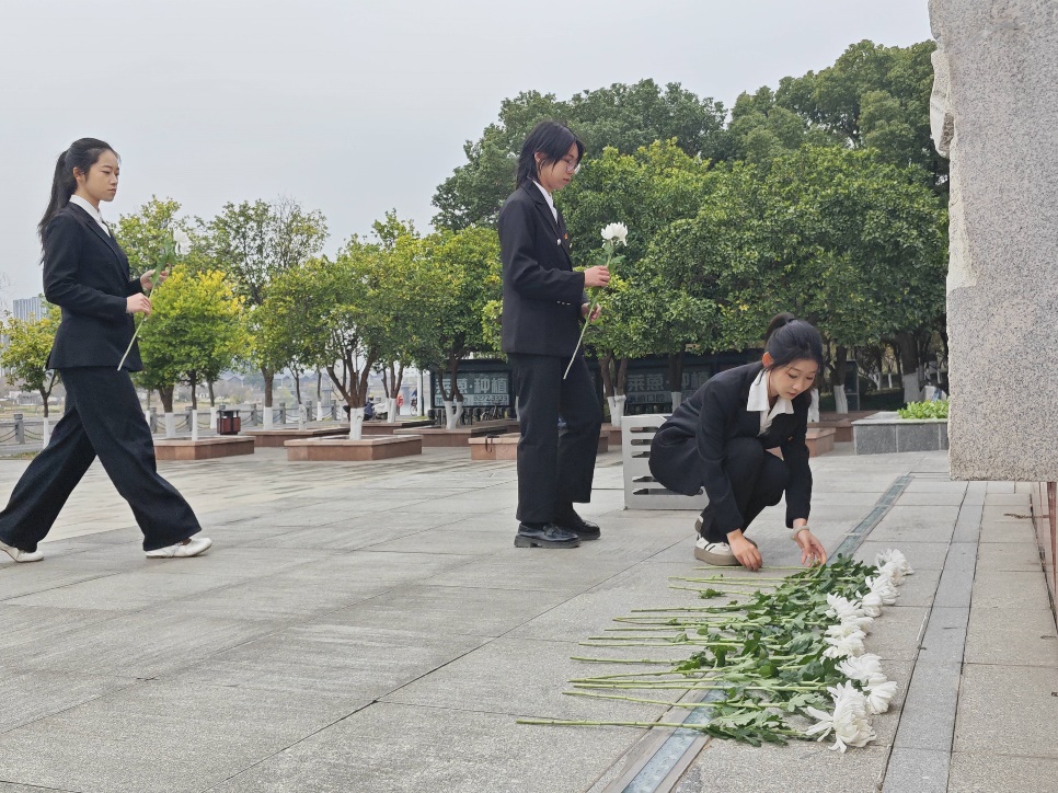 上午9点,金华抗日战争纪念碑前庄严肃穆,全体人员整齐列队,为所有在日本帝国主义侵华战争期间惨遭杀戮的死难同胞默哀。默哀结束后,师生代表们手持白菊,依次向纪念碑敬献鲜花。活动现场,金华市委党史研究室室务会成员、宣教处处长姜燕飞向师生们宣讲了金华的抗战历史,生动讲述了八婺大地上曾经发生过的可歌可泣的抗战故事。