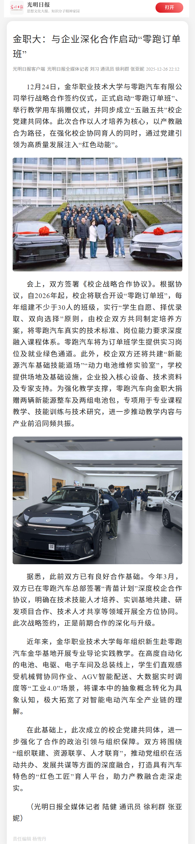 光明日报客户端:金职大:与企业深化合作启动“零跑订单班”