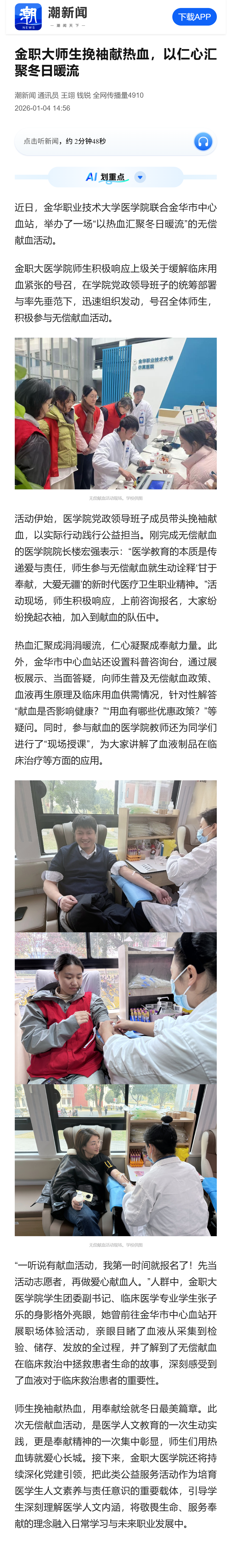 潮新闻:金职大师生挽袖献热血,以仁心汇聚冬日暖流