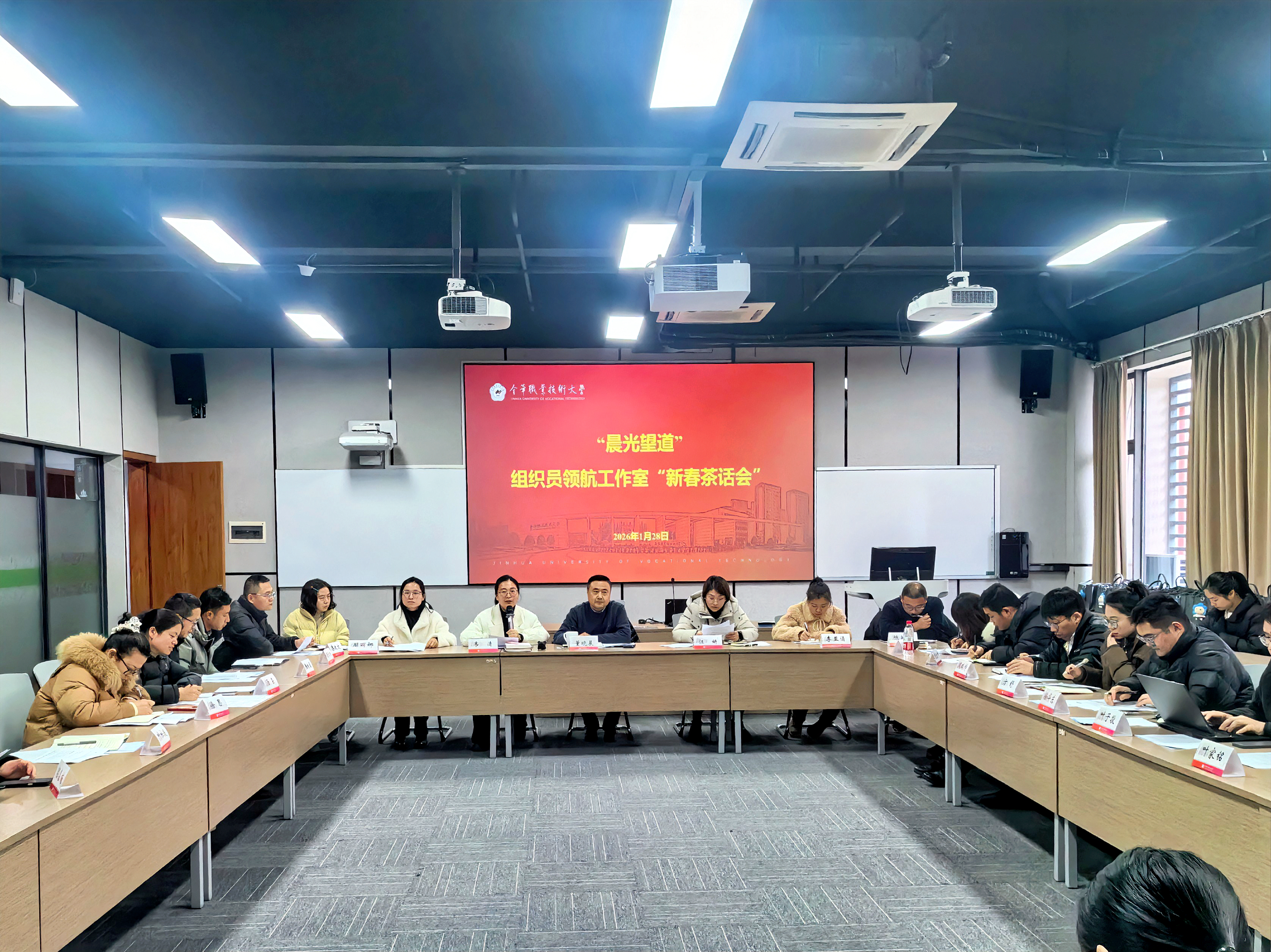 1月28日,“晨光望道”组织员领航工作室协同金华职业技术大学“悟理晨光”校级组织员领航工作室举办2026年“新春茶话会”。校党委委员、组织部部长、“晨光望道”组织员领航工作室负责人董晓晨出席会议并讲话。全体“四强”和“骨干”组织员培养对象、组织部相关人员参加会议。