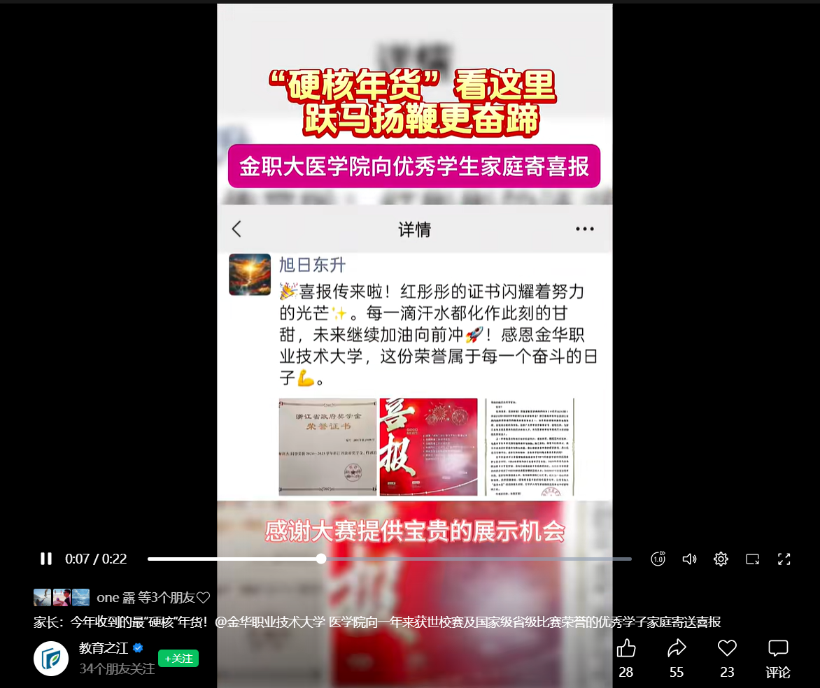 教育之江视频号:家长:今年收到的最“硬核”年货!@金华职业技术大学 医学院向一年来获世校赛及国家级省级比赛荣誉的优秀学子家庭寄送喜报